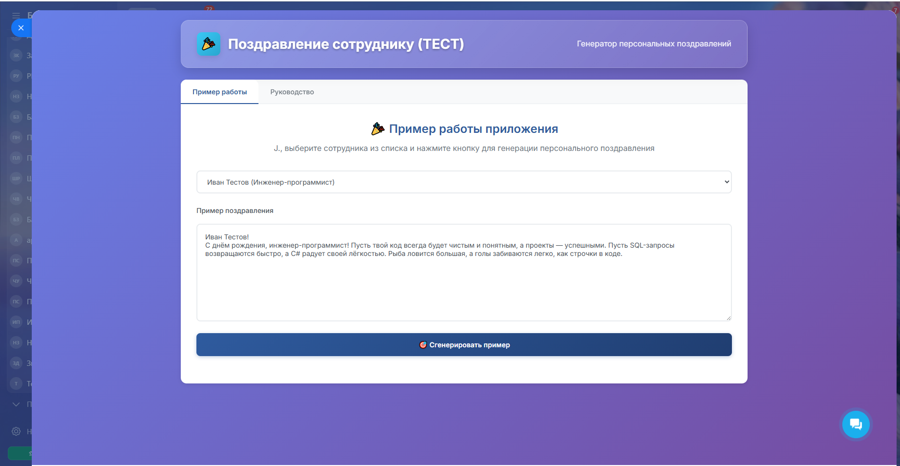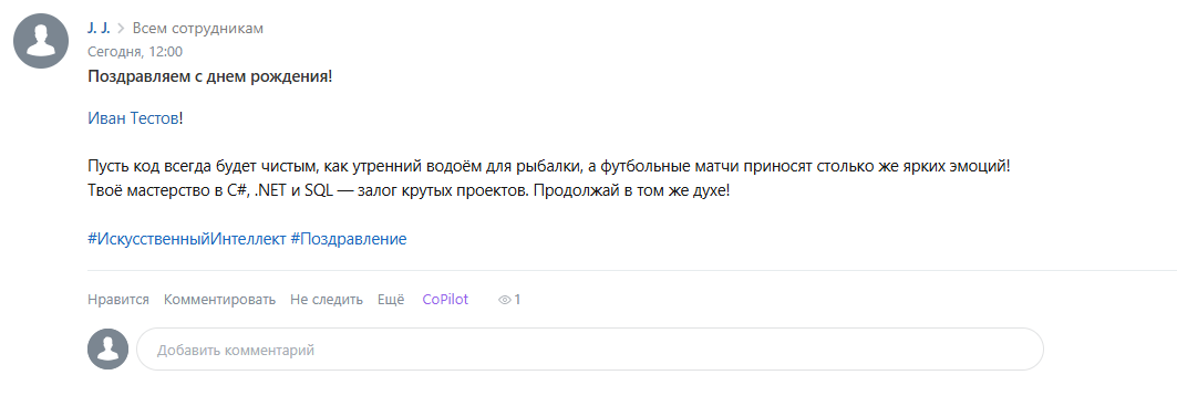 2. Для того, чтобы поздравление получилось наиболее интересным и оригинальным, нужно, чтобы в персональной карточке пользователя были заполнены его должность, интересы и навыки. Это не обязательное условие, но его выполнение делает текст поздравления ярче.