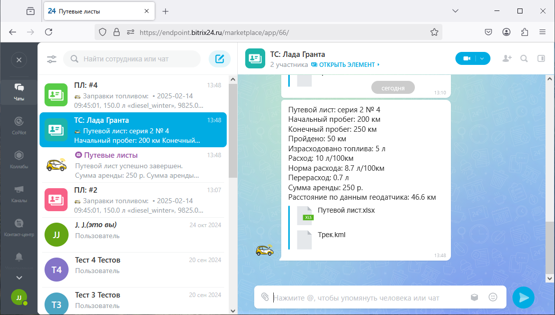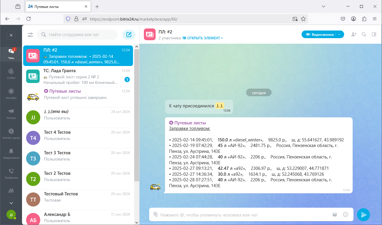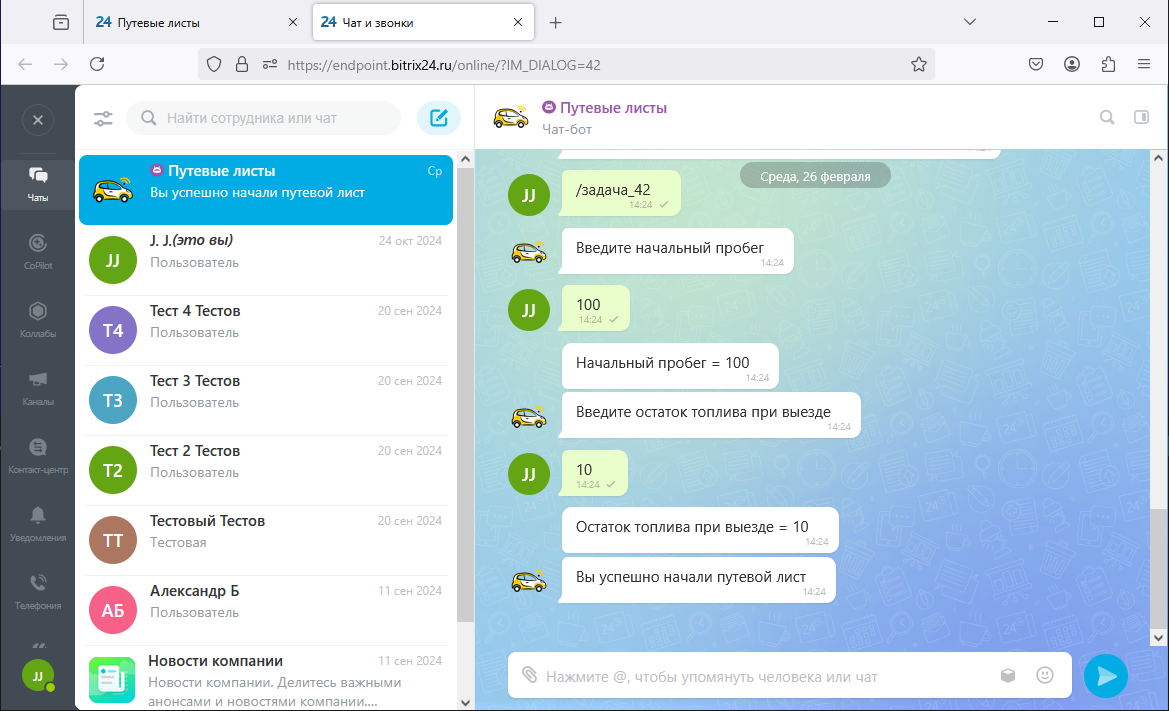- открывать и завершать путевые листы сотрудниками компании посредством диалога с чат-ботом;