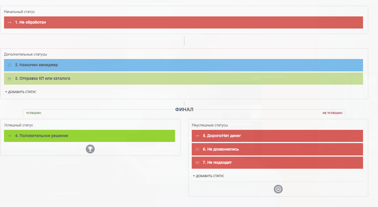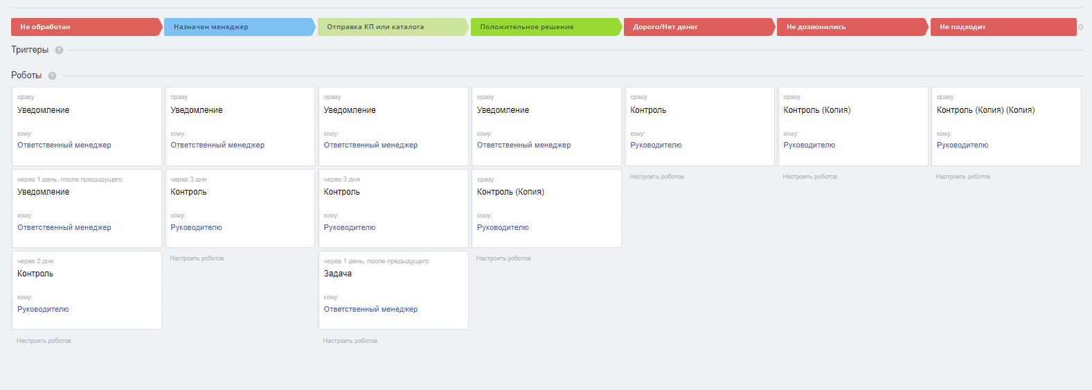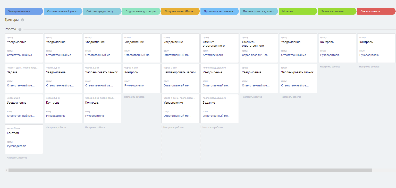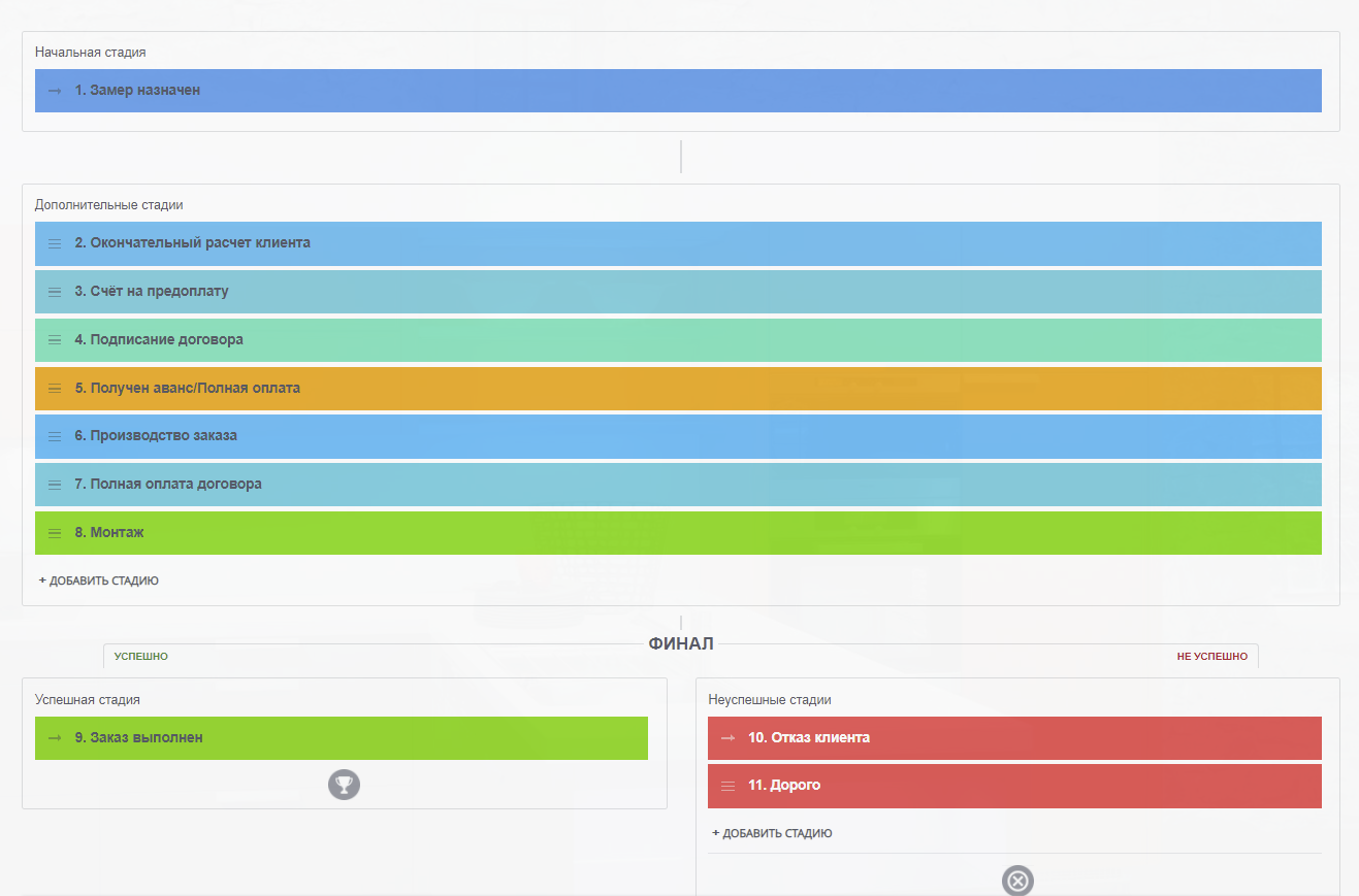 В нашем готовом решении CRM. "Кухни на заказ" предусмотрена одна основная воронка продаж: