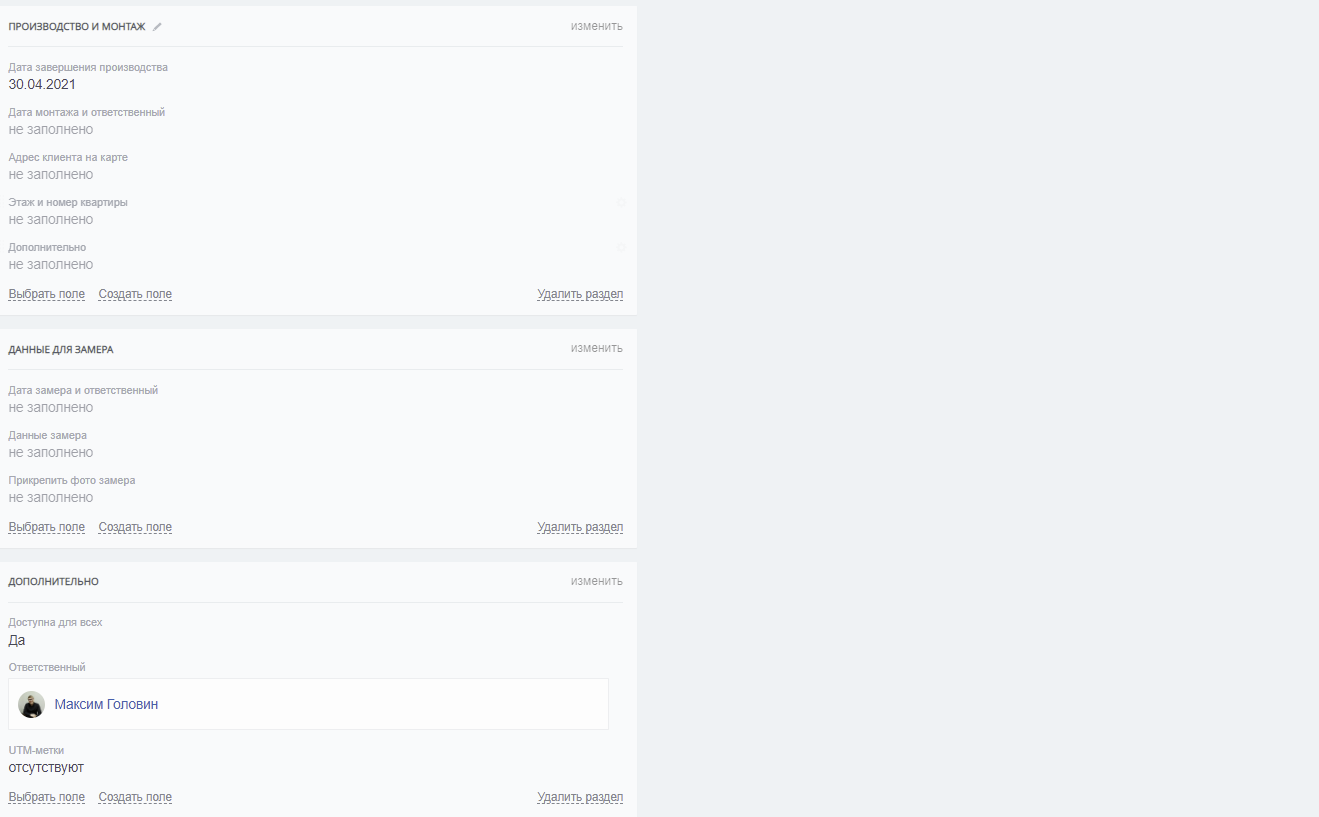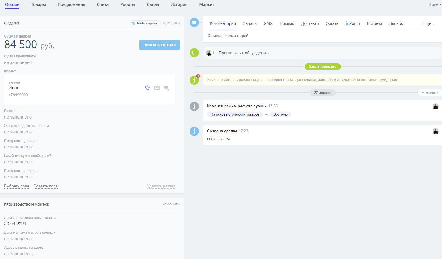Готовое решение производства и продаж кухонь подходит тем, кто хочет оптимизировать работу компании, контролировать сделку на каждом этапе, а также стремится качественно работать с повторными продажами. Наше решение поможет каждому сотруднику контролировать свои сделки, а руководители смогут отслеживать сделки подчиненных и необходимые показатели в режиме реального времени. А для того, чтобы работать с большим количеством информации было удобнее, в решении настроены карточки лида, сделки и контакта.