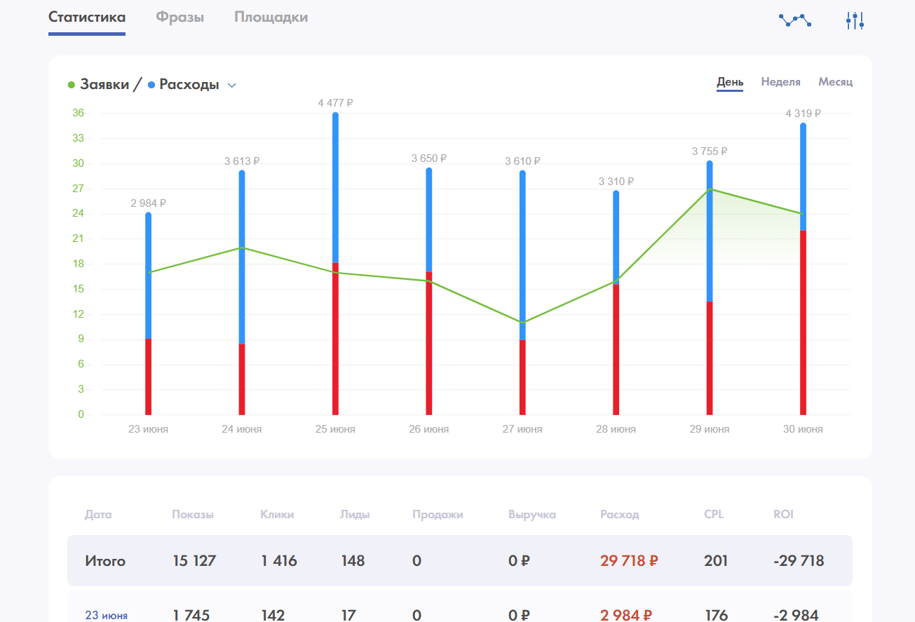 Если код установлен на ваш сайт, а реклама создана и подключена, то в разделе аналитика вы сможете видеть статистику по эффективности рекламы по каналам, отслеживать параметры CPL, ROI