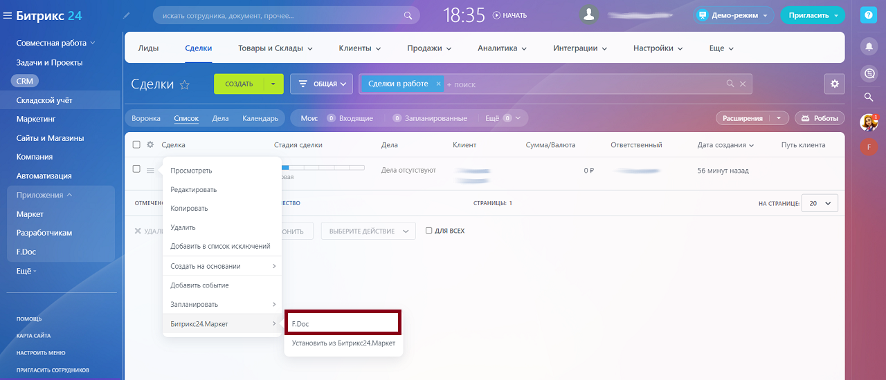 b. На детальной странице в блоке «Детальные действия», пункт меню «F.Doc». После установки приложения пункт «F.Doc» может появится в пункте «Еще». Вы можете переместить его, перетащив в удобное вам место.
