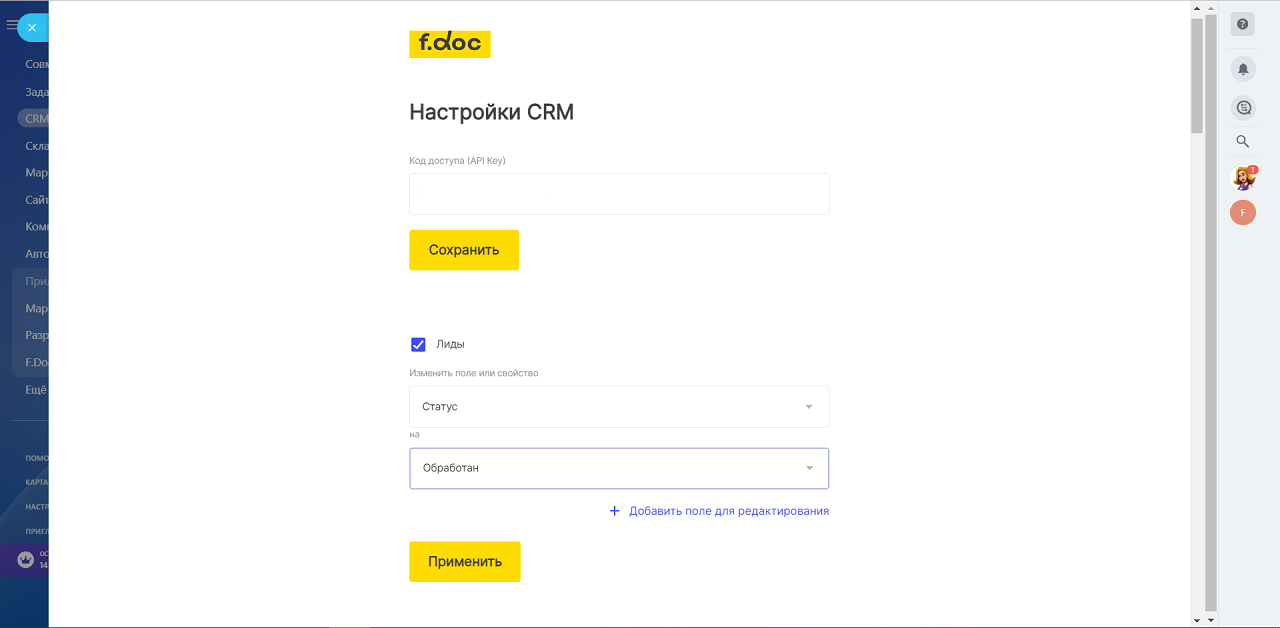 После установки приложения введите полученный API Key на странице настроек приложения (доступна пользователям с правами администратора в пункте меню «Приложения») и включите электронное подписание документов для необходимых разделов (электронное подписание доступно для сделок, лидов, компаний и контактов), при необходимости настройте изменения полей или свойств после успешного подписания документов: