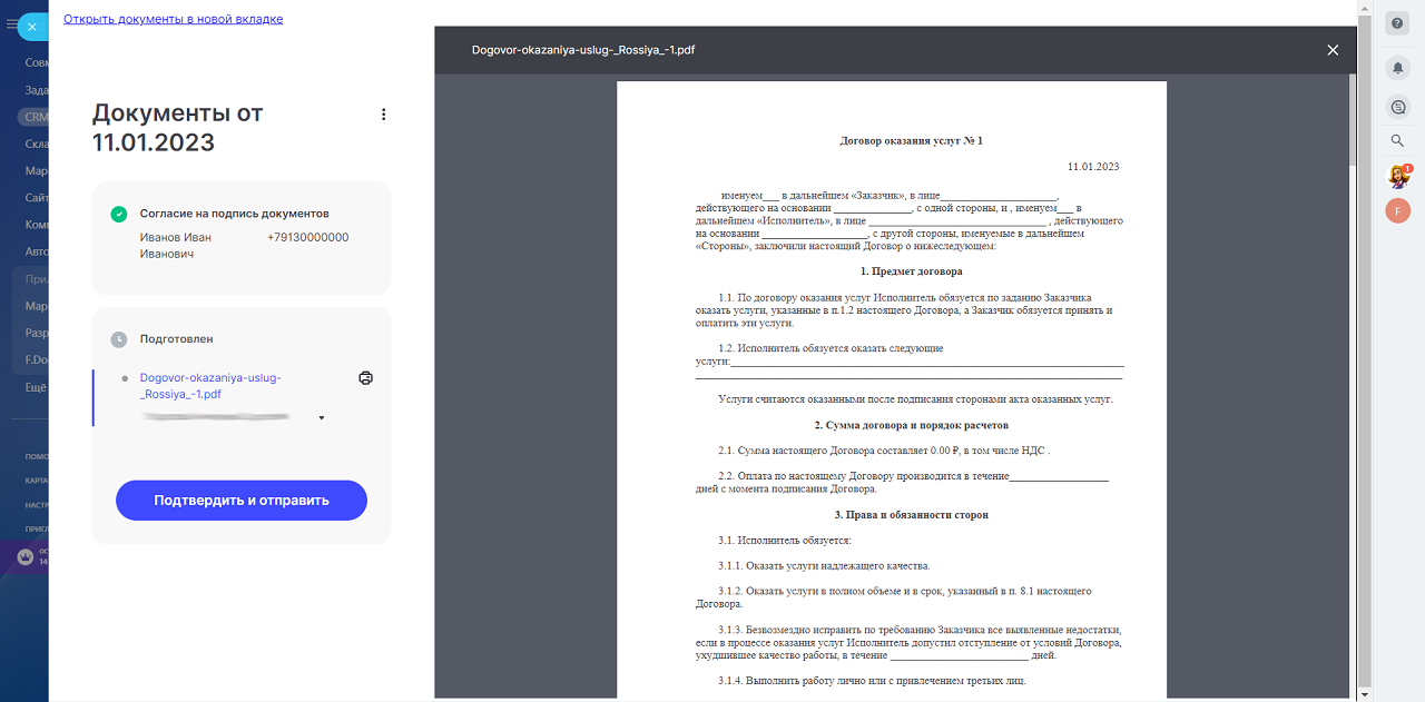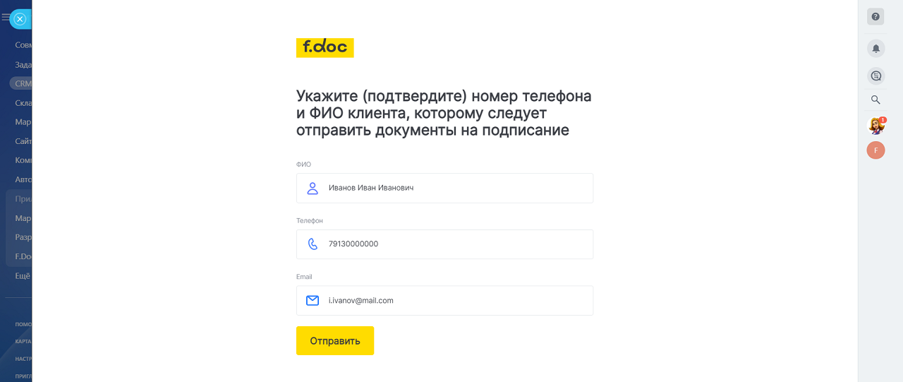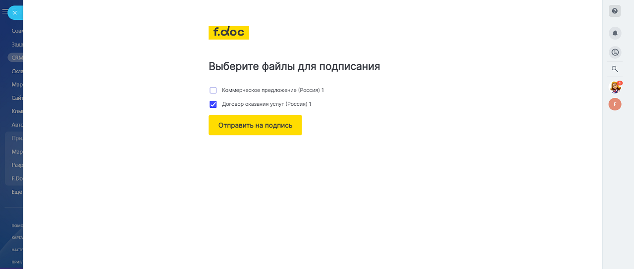 F.Doc встраивается в вашу CRM-систему. Из Битрикс24 вы можете нажатием одной кнопки отправить клиентам договоры, дополнительные соглашения, заявления и другие документы. Использование сервиса для подписания документов ЭЦП позволяет просто, быстро и онлайн осуществлять документооборот в компании.