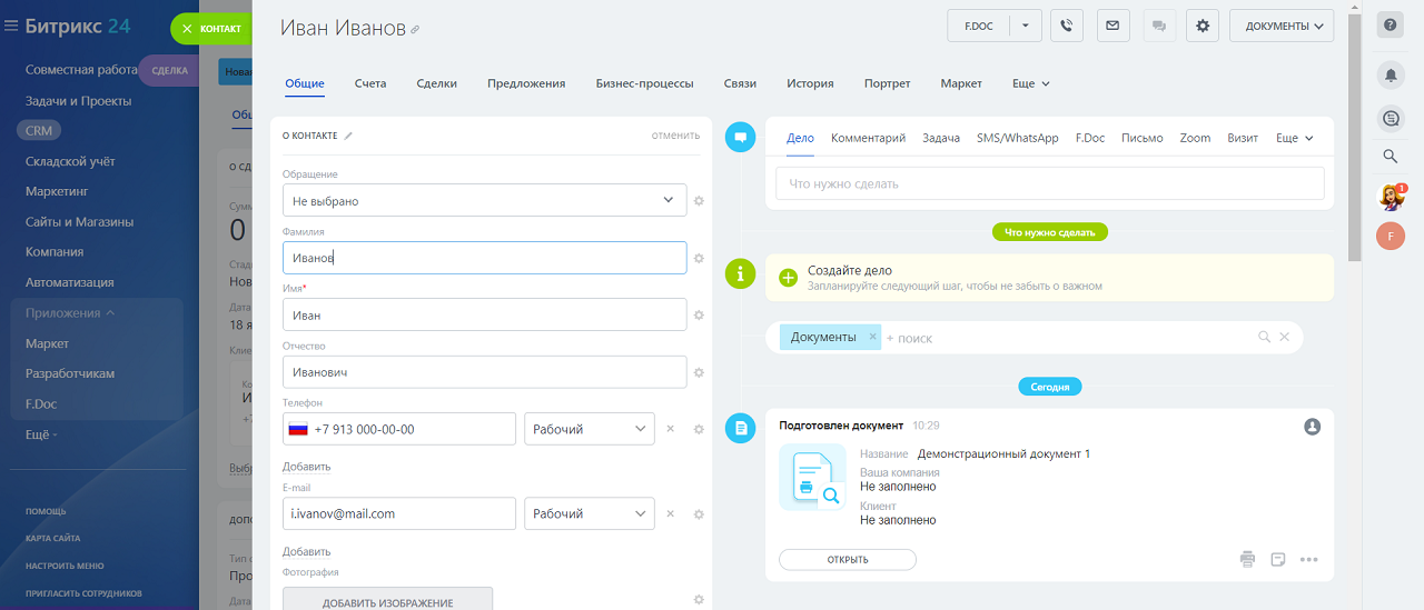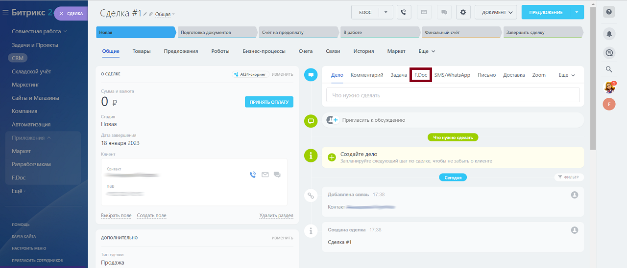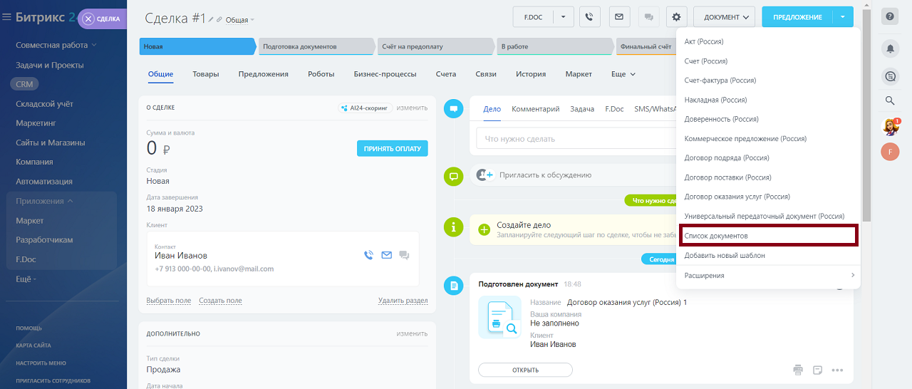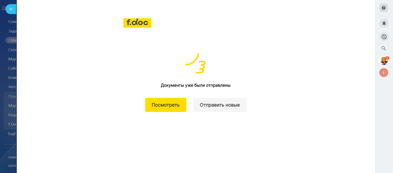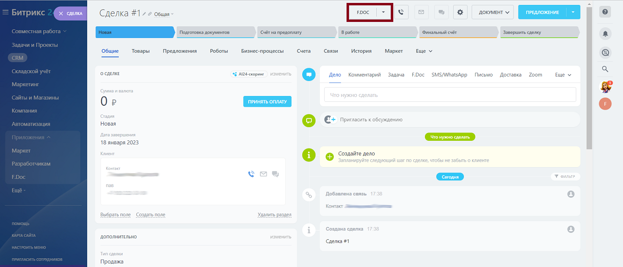 1. После включения подписания документов для раздела (сделка, лид, компания или контакт) доступны пункты меню «F.Doc» для вызова страницы подписания документов:
