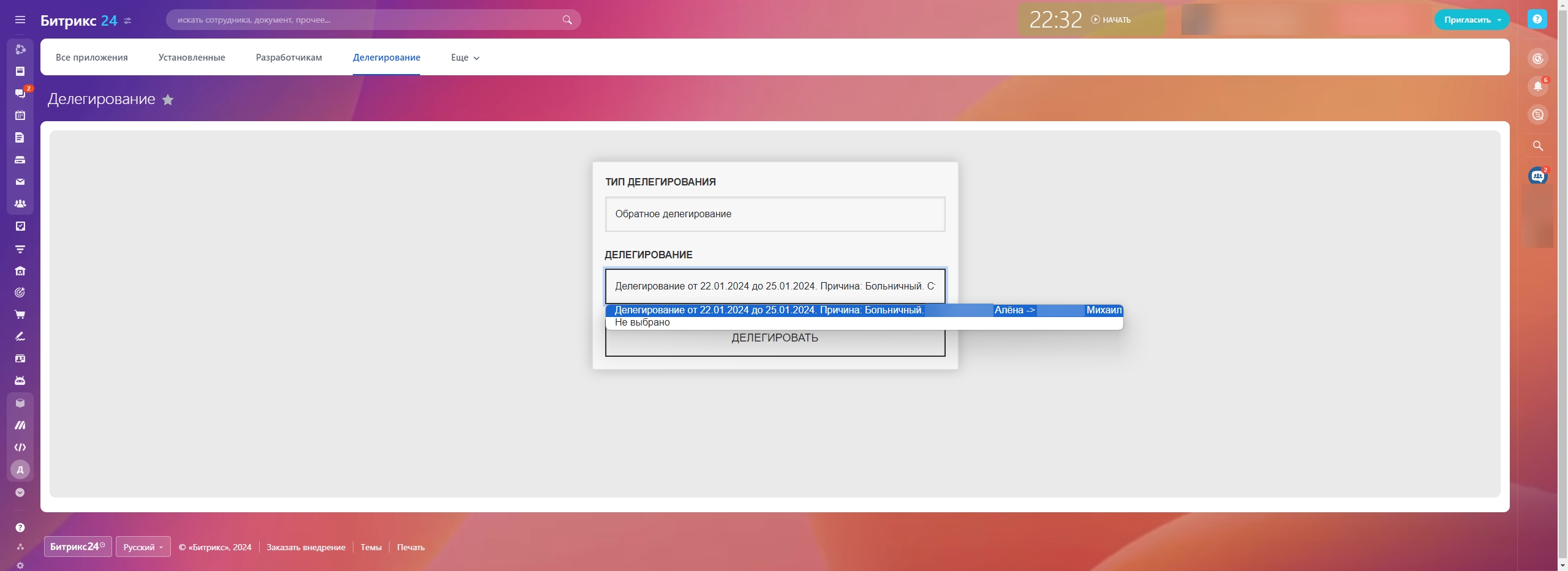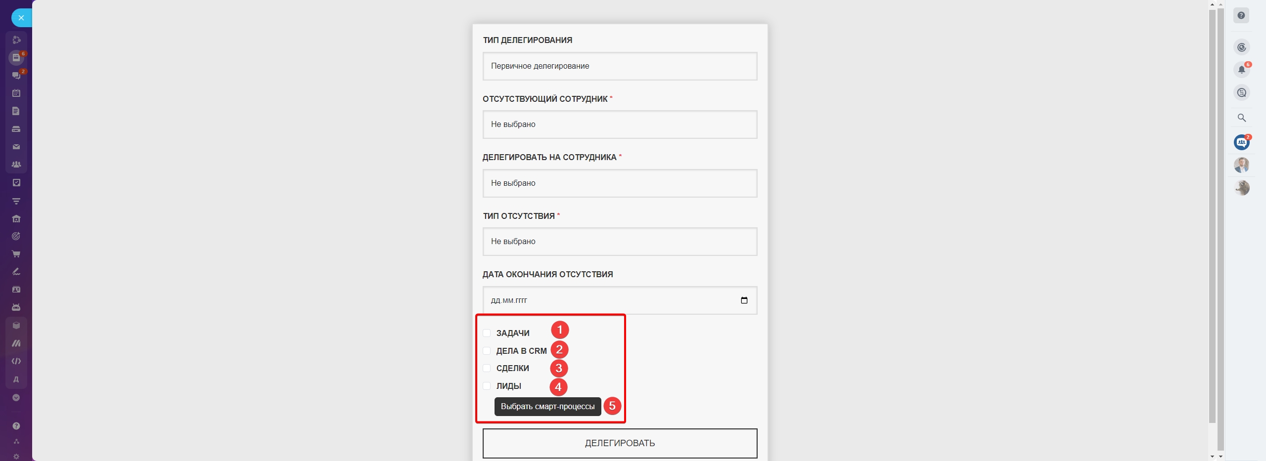Бит.Делегирование - ваш надежный инструмент для передачи задач, сущностей CRM и смарт-процессов на время отсутствия сотрудника или увольнения.