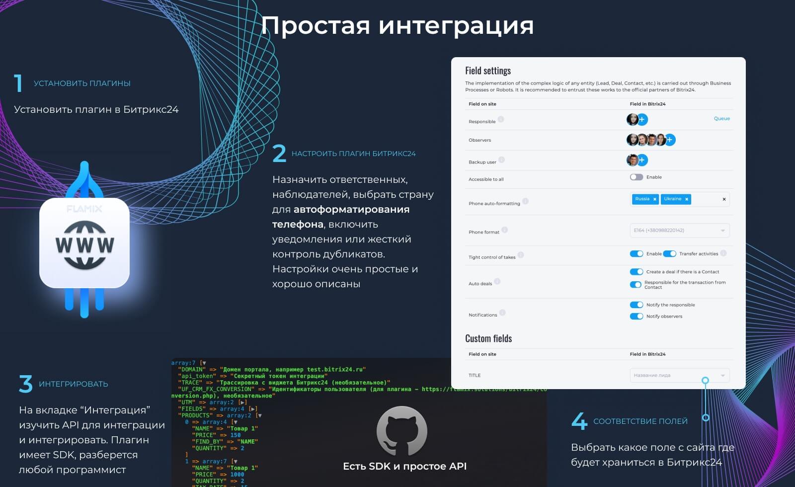 - Автоматическая передача форм и заказов в ЛИДы и Сделки;