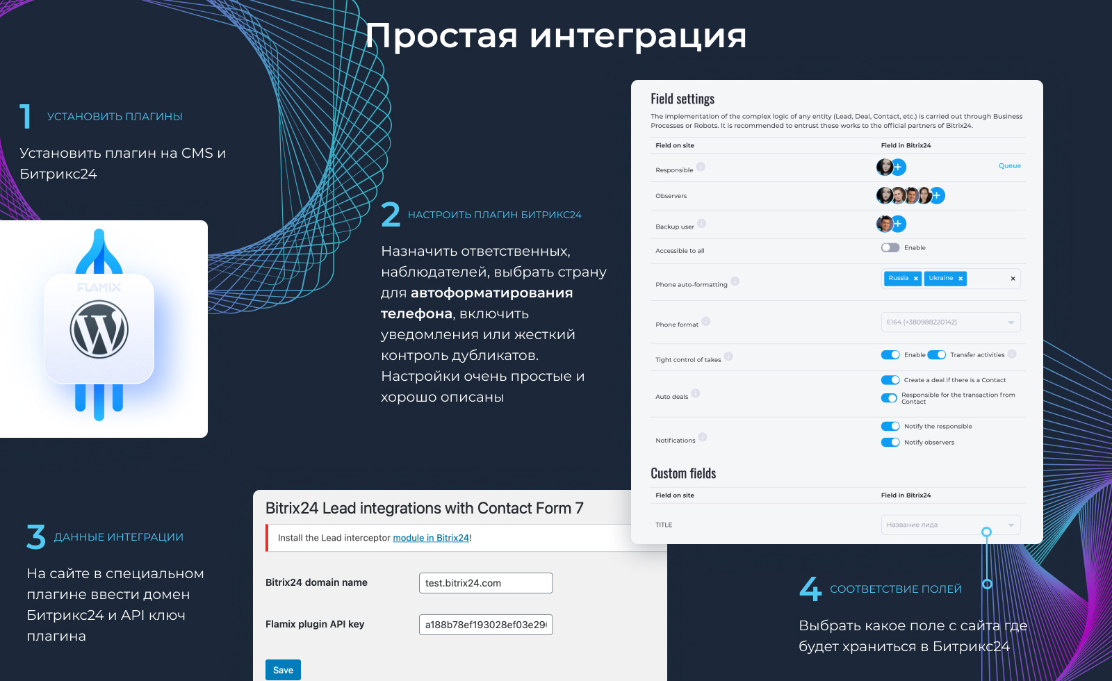 - Автоматическая передача форм и заказов в ЛИДы и Сделки;