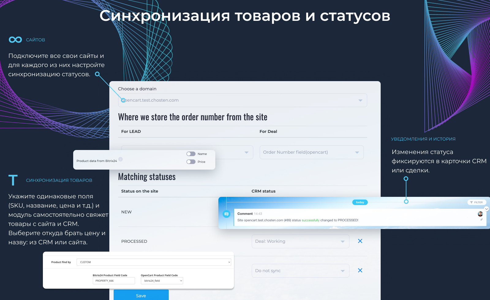 - Связывание товаров с сайта и Битрикс24 для корректного складского учета и интеграции с 1С;