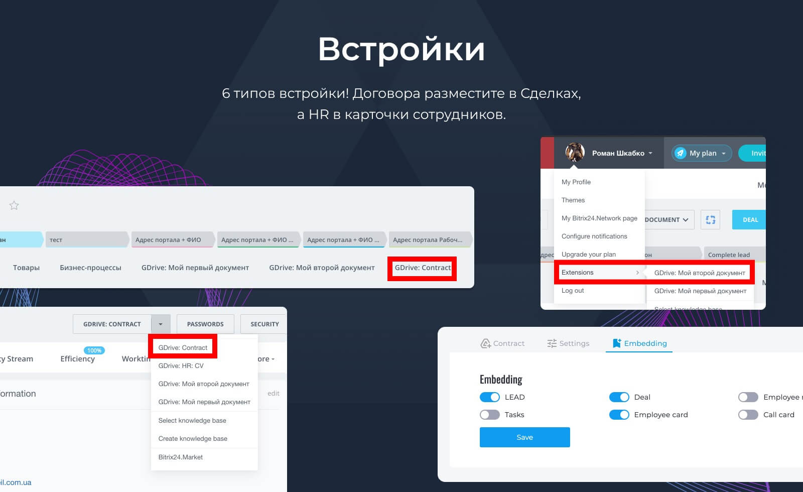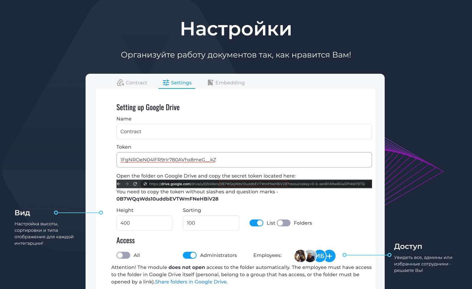 - Встройка конкретной папки в нужное место (Например, договора можно встроить в CRM Сделку);