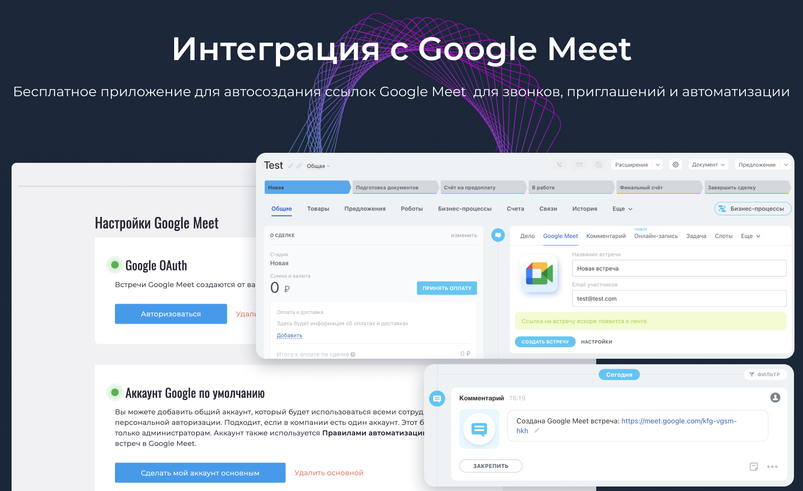 Интеграция позволяет создавать и управлять видеозвонками Google Meet прямо в CRM, без переключения между инструментами. Идеально подходит для отделов продаж, службы поддержки и менеджеров, ценящих скорость, надёжность и автоматизацию общения с клиентами.