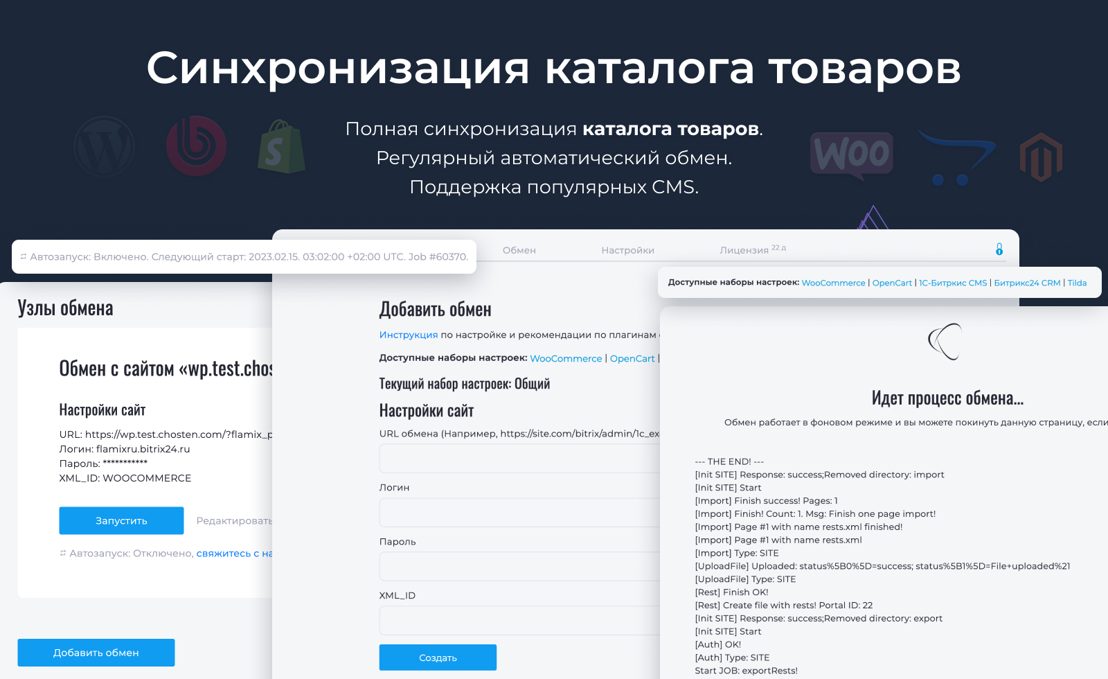 Синхронизация структуры каталога и товаров. Поддерживает ручной и регулярный автоматический режим.