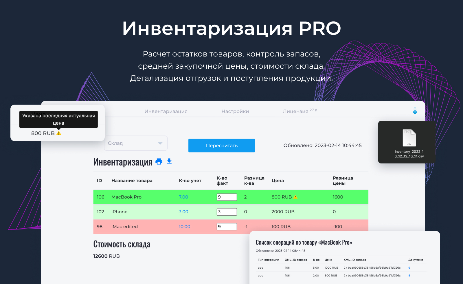 Расчет остатков продукции, контроль запасов, средней закупочной цены, стоимости склада. Подробная информация об отгрузке и получении продукции.