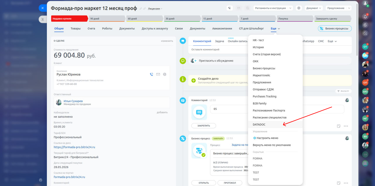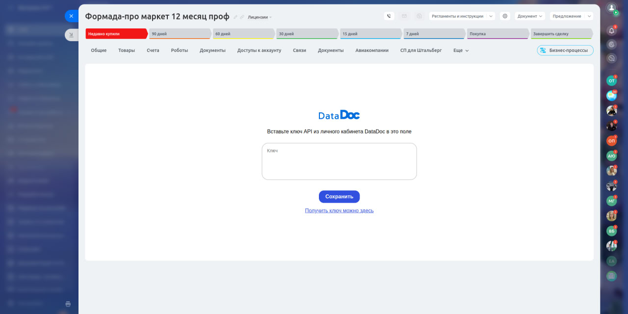 - Перейдите в лид или сделку, наведите на "Еще" > DataDoc. В открытую форму вставьте апи ключ со страницы «настройки» вашего кабинета DataDoc