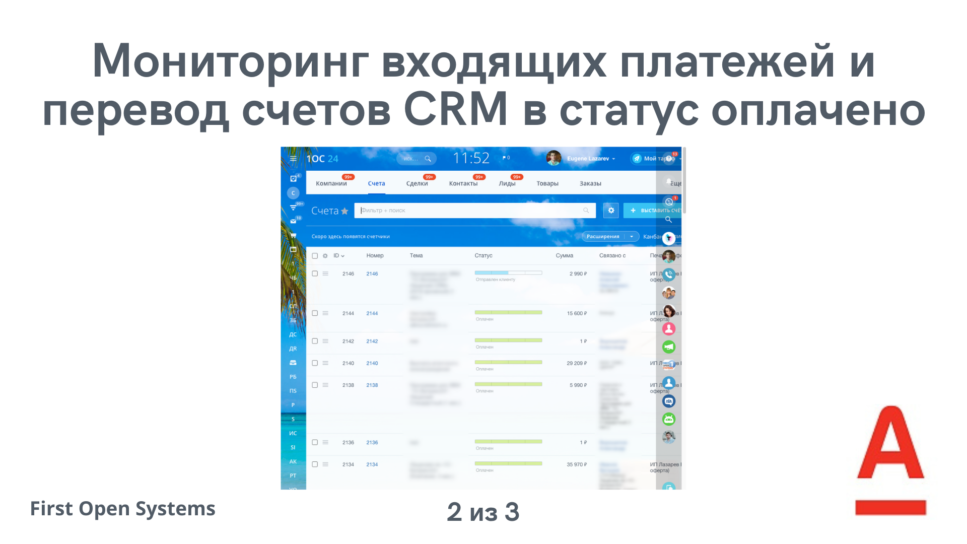 - Мониторинг входящих платежей и перевод счетов CRM в статус оплачено (поиск по ИНН и сумме платежа)