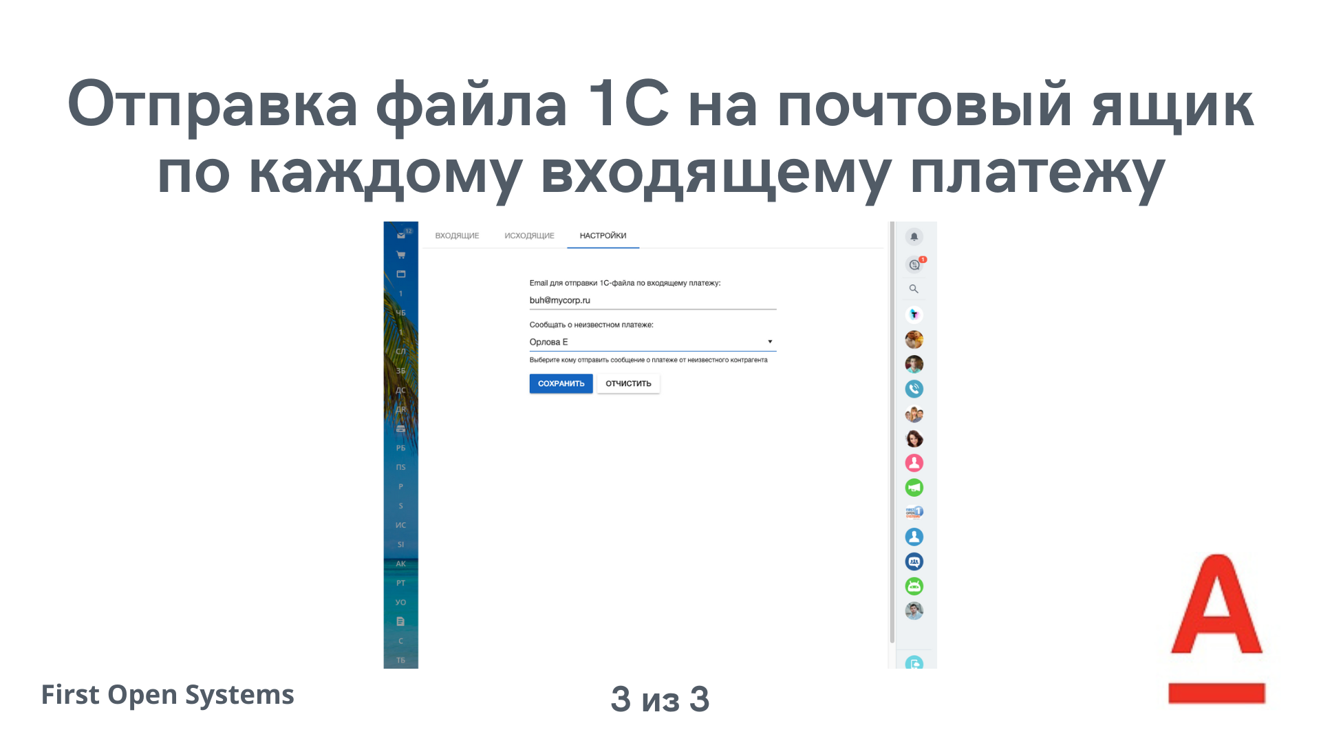 - Отправка файла 1С на почтовый ящик по каждому входящему платежу