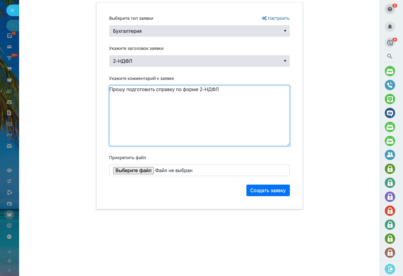 Так же в системе имеется возможность настроить для определенных групп шаблонные сообщения. Например, в созданную ранее группу "Бухгалтерия" можно добавить шаблон с именем "Выдача справки 2НДФЛ" и текстом "Прошу выдать мне справку по форме 2НДФЛ". В дальнейшем пользователь сможет выбрать этот шаблон, отредактировать текст и отправить его ответственному лицу.