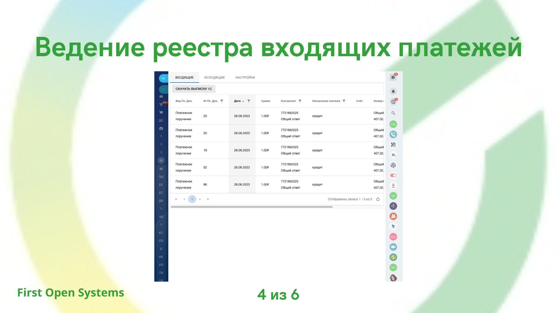 - Ведение реестра входящих платежей