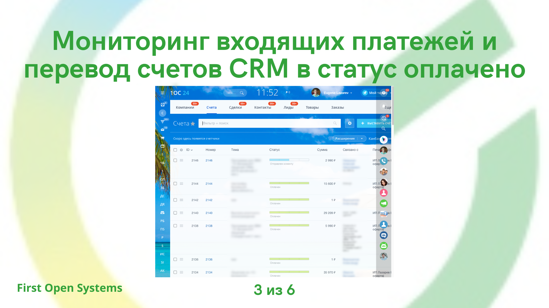 - Мониторинг входящих платежей и перевод счетов CRM в статус оплачено (поиск по ИНН и сумме платежа)