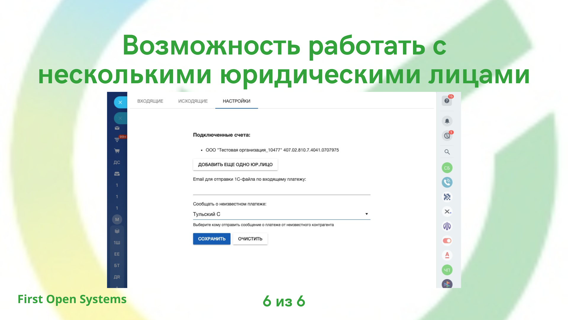 - Поддержка нескольких Юр. Лиц и нескольких счетов