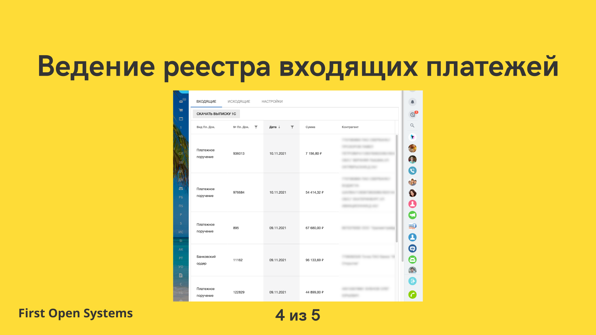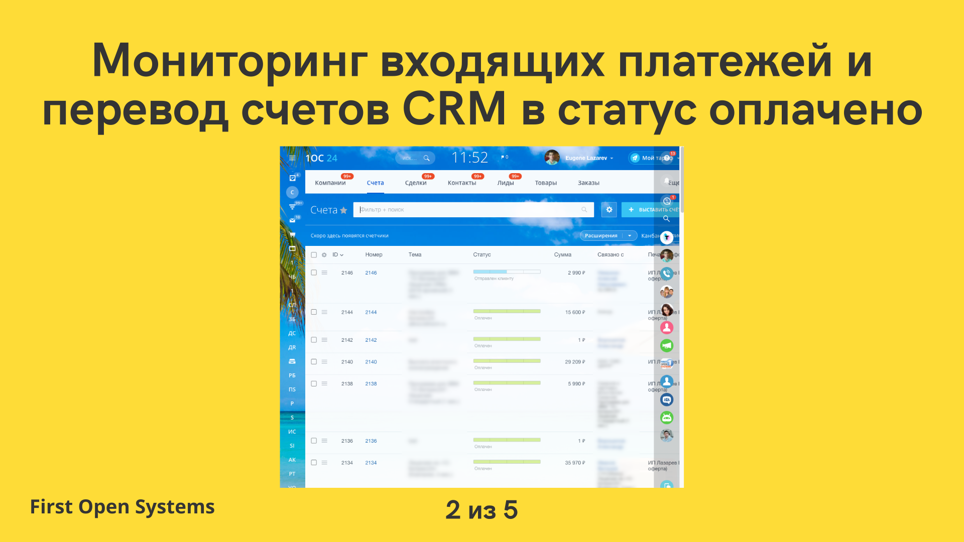 - Мониторинг входящих платежей и перевод счетов CRM в статус оплачено (поиск по ИНН и сумме платежа)
