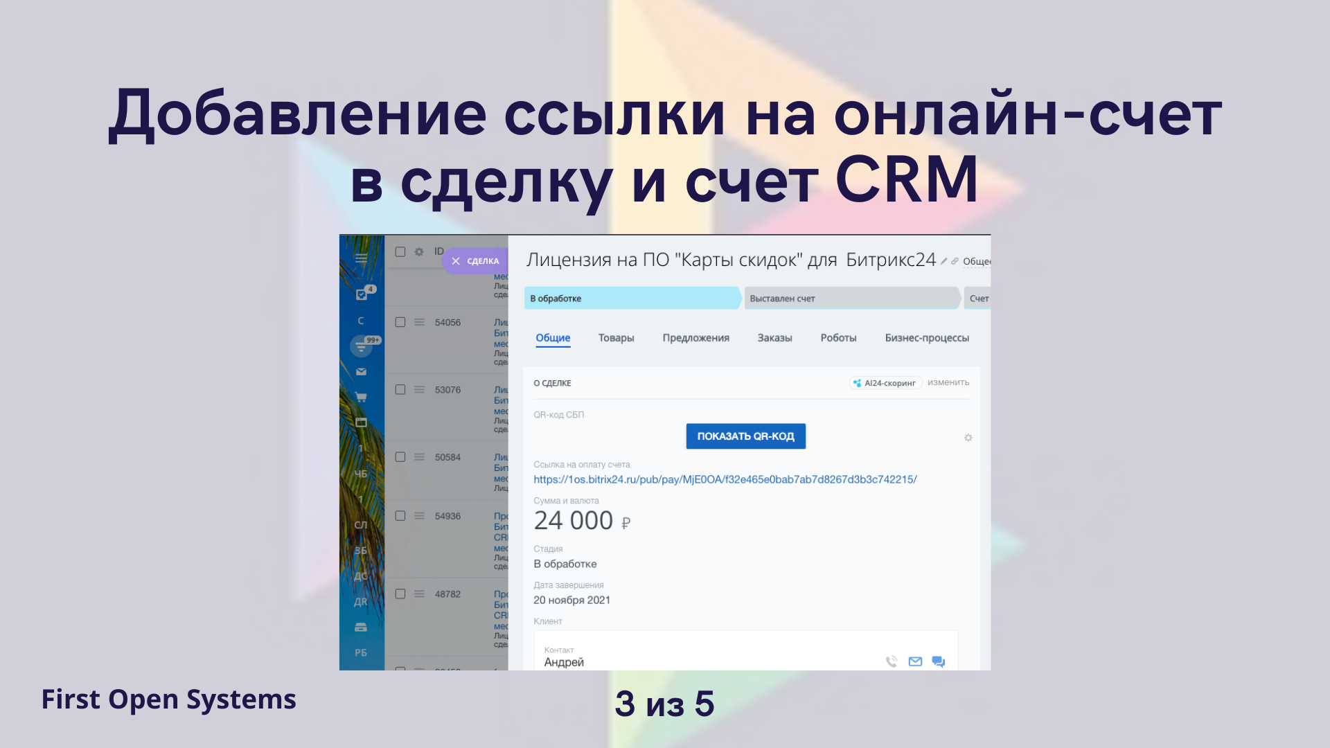 - Добавляет ссылку на онлайн-счет в сделку и счет CRM
