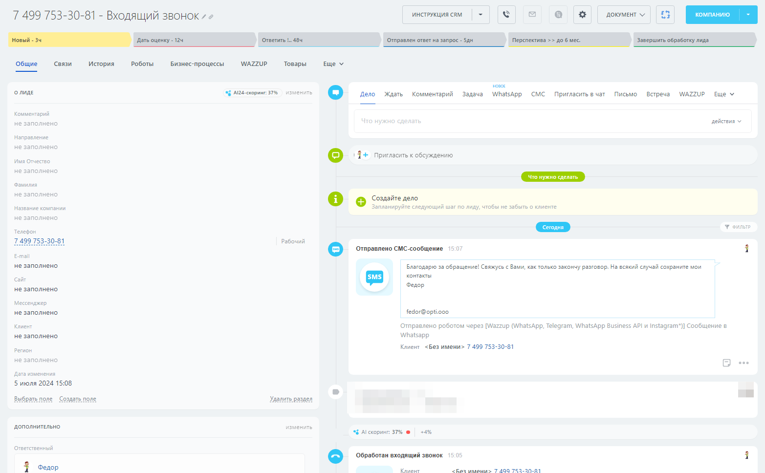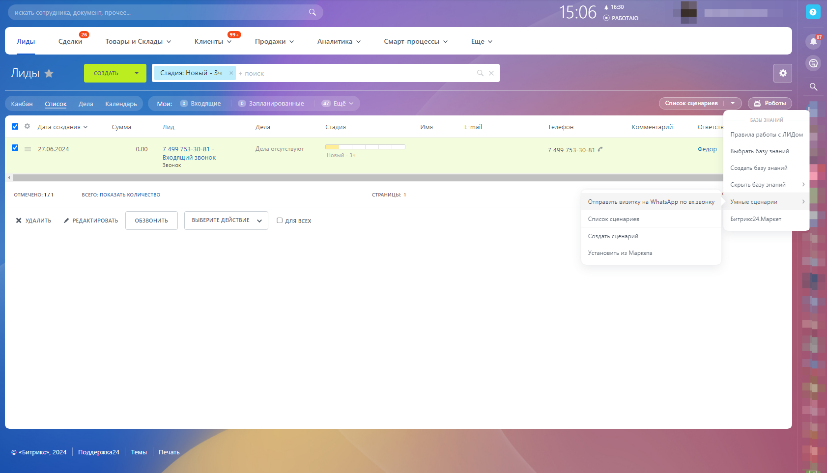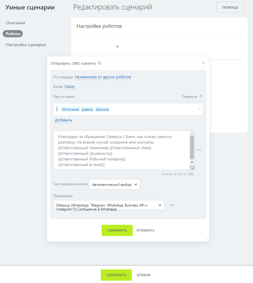 Настроенный сценарий позволяет отправлять готовый шаблон сообщения клиенту. Дополнительно проверяется условие: Источник = Звонок.