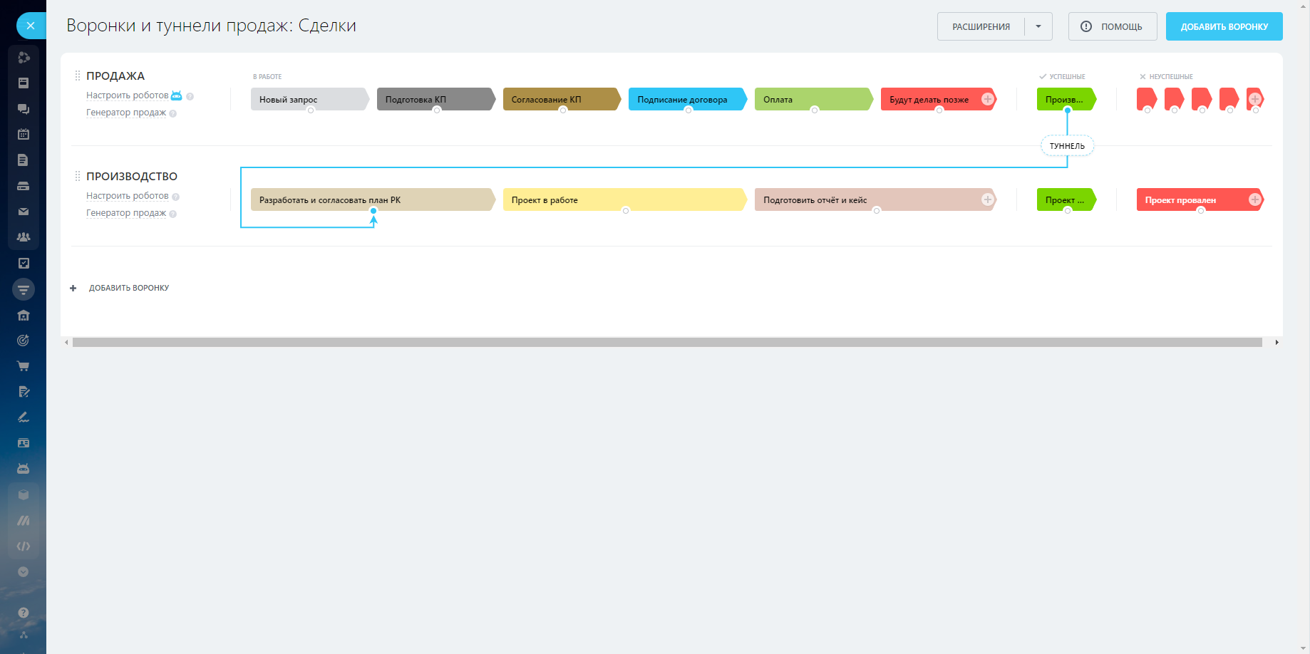 На стадии «Производство» происходит копирование сделки в воронку «Производство» на стадию «Разработать и согласовать план РК».