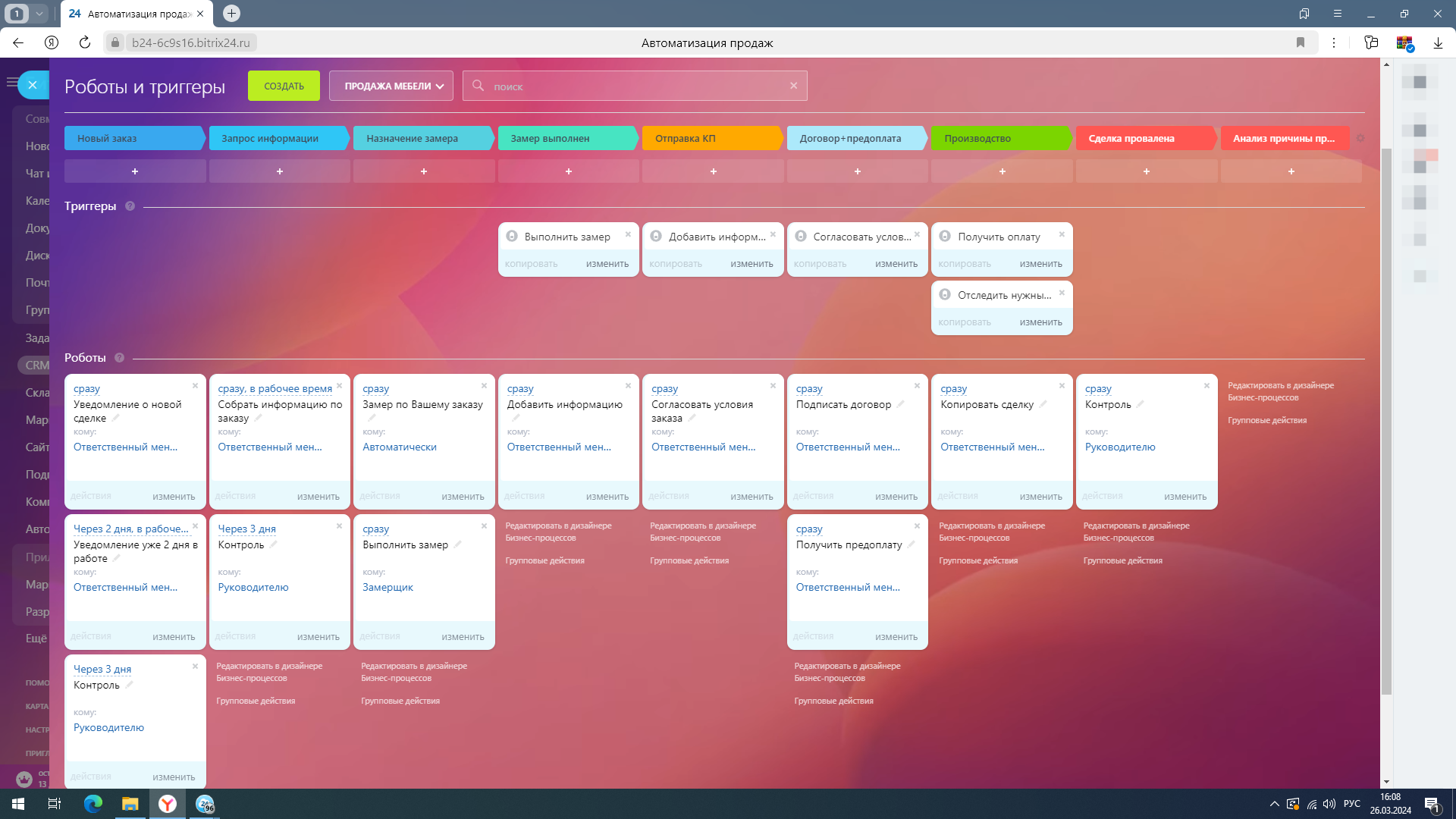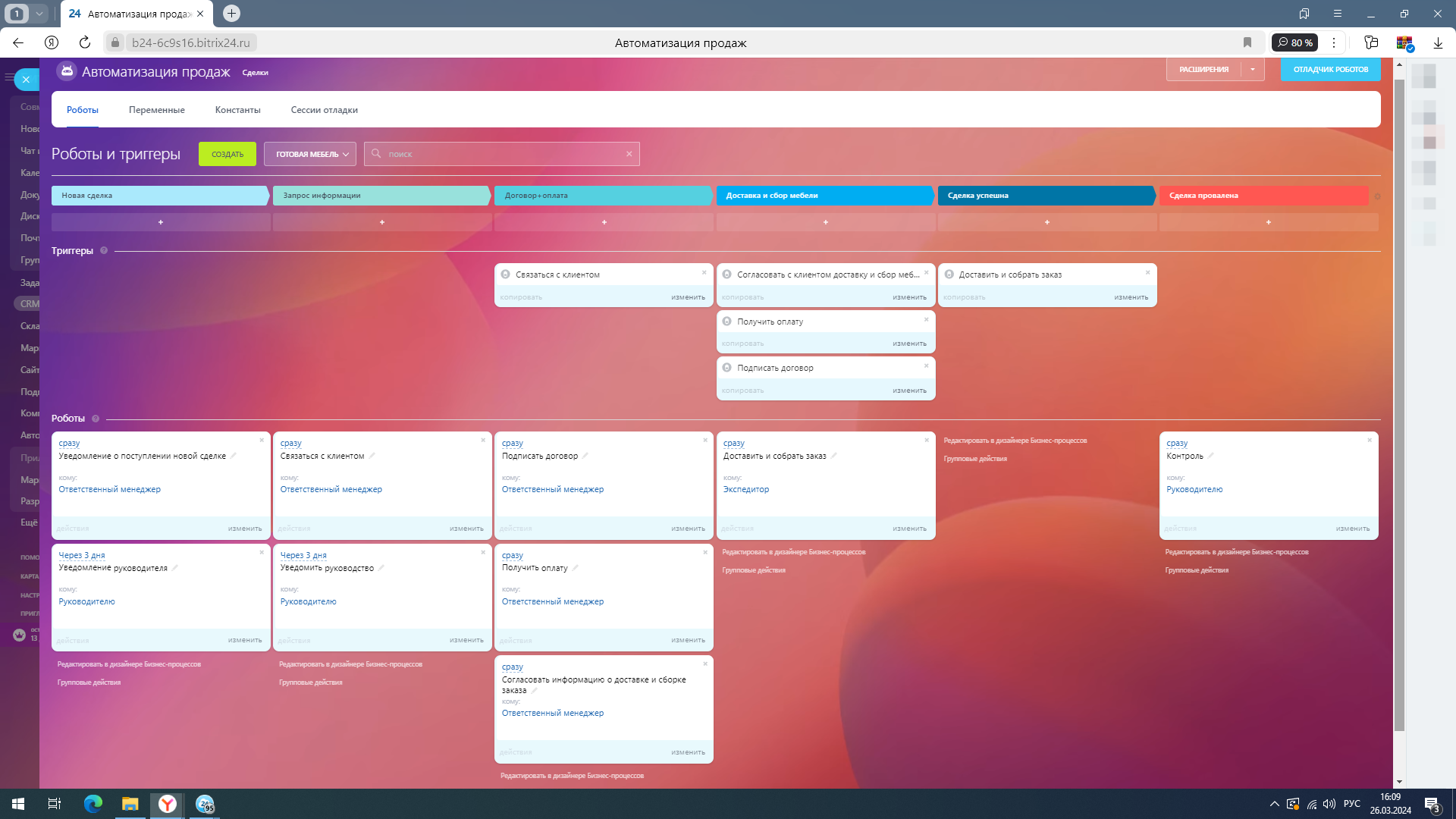 На стадии «Договор + оплата» ставятся задачи «Подписать договор», «Получить оплату», «Согласовать с клиентом доставку и сбор мебели». При закрытии данных задач сделка переходит на стадию «Доставка и сбор мебели».