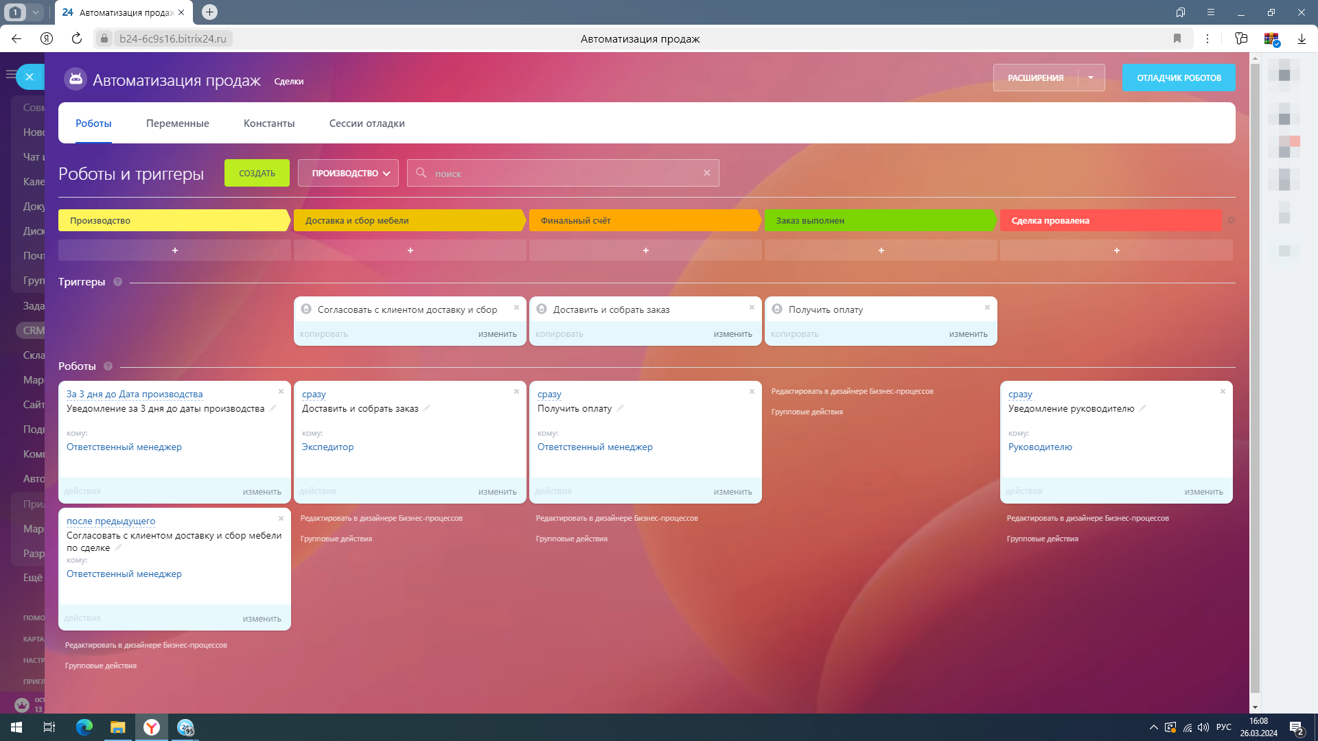 В воронке «Производство» на стадии «Производство» отправляется уведомление за 3 дня до даты производства. После данной автоматизации ставится задача «Согласовать с клиентом доставку и сбор мебели». При закрытии данной задачи сделка переходит на стадию «Доставка и сбор мебели». На данной стадии следующие обязательные поля: адрес, подъезд, этаж, квартира.