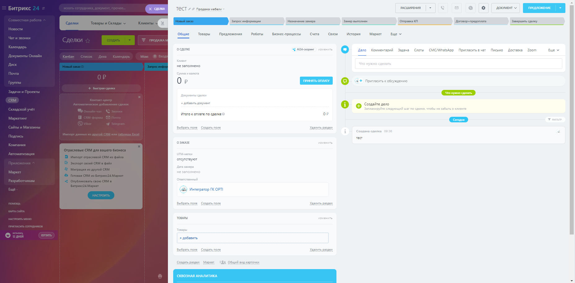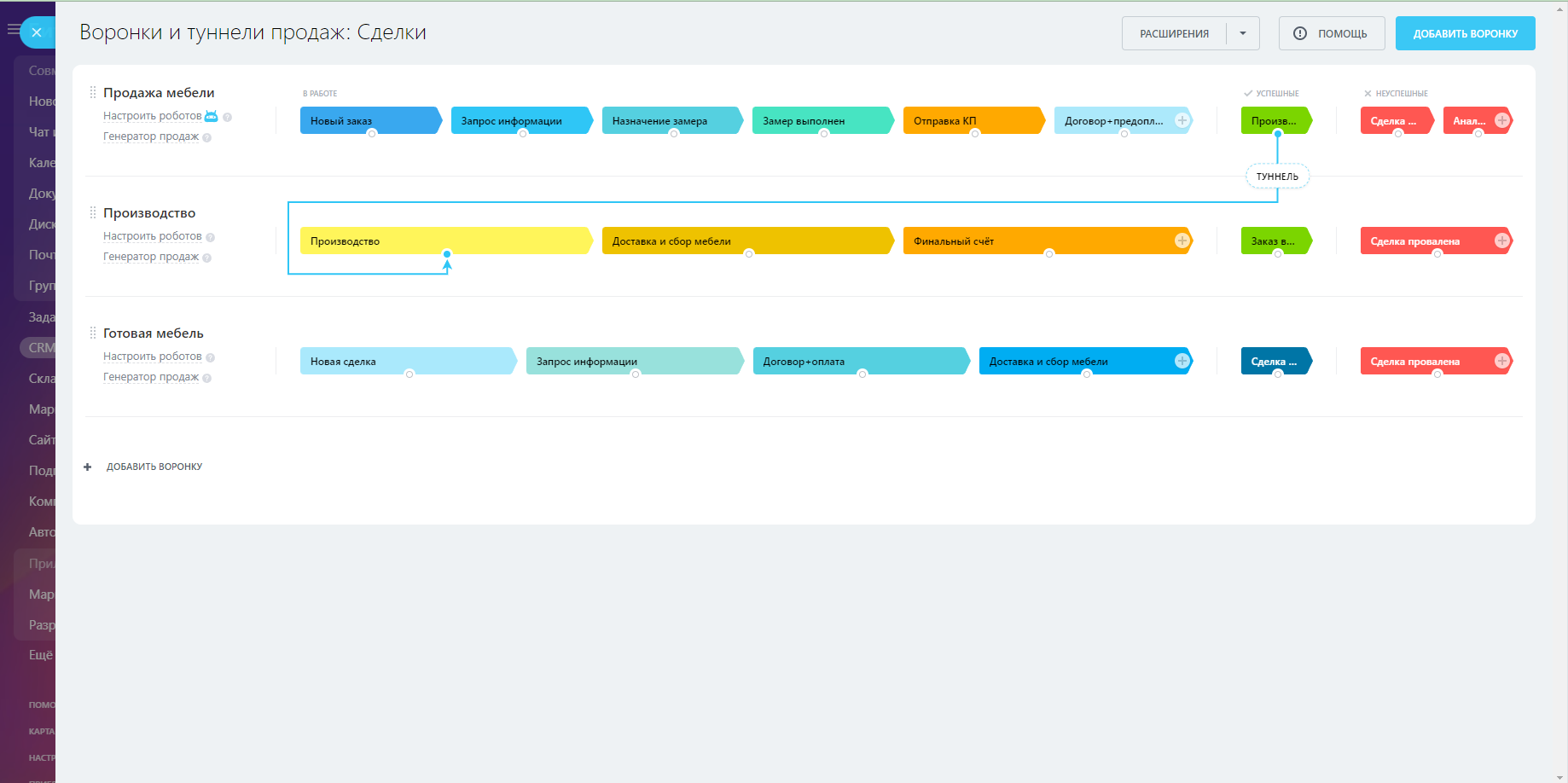 CRM для вашего бизнеса полностью настроена. При настройках учли все этапы Сделки. Созданы воронки сделок: · Продажа мебели · Производство · Готовые изделия