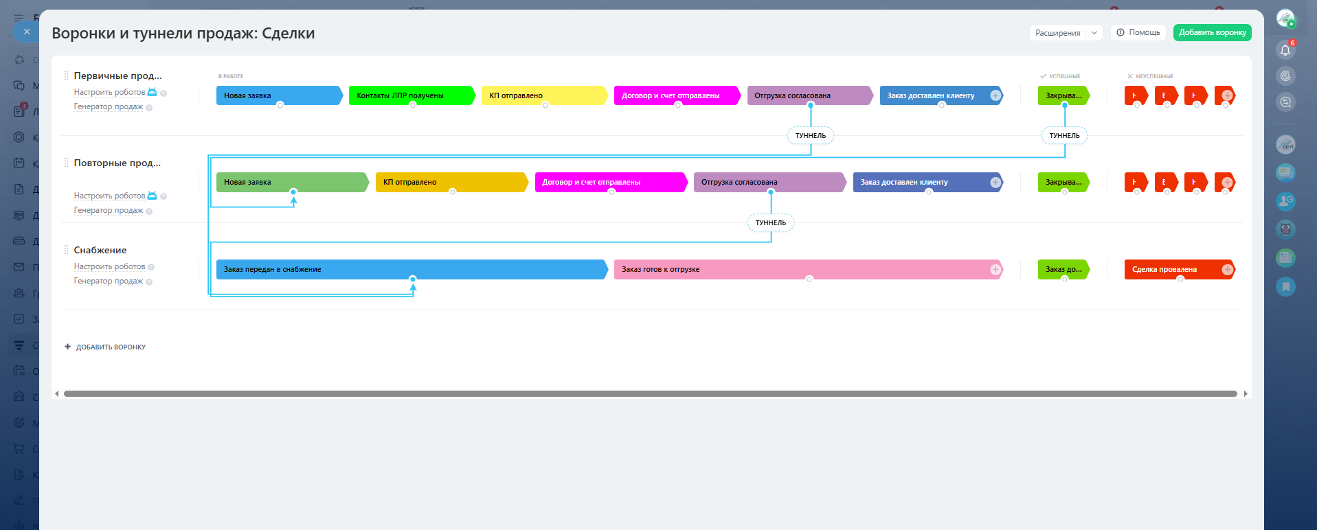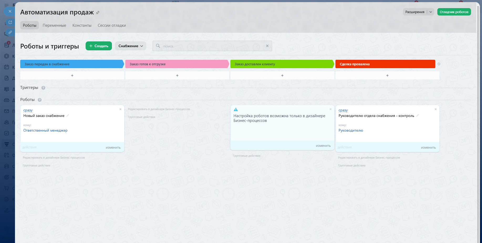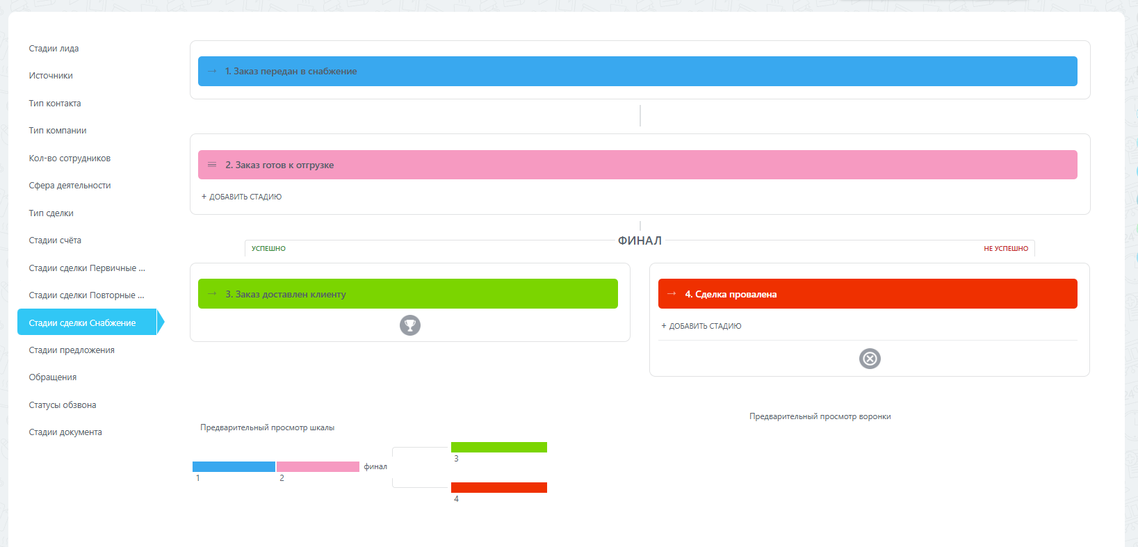 В воронке Снабжение при создании сделки на стадии «Заказ передан в снабжение» менеджеру по снабжению ставится дело «Новый заказ в воронке Снабжение».