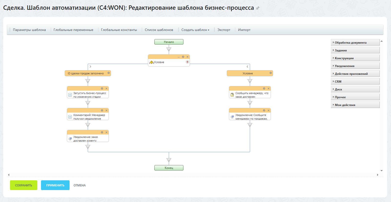 Менеджер по продажам получит уведомление о том, что заказ доставлен клиенту, а в таймлайне карточки сделки сохранится комментарий о том, что менеджер по продажам получил уведомление.