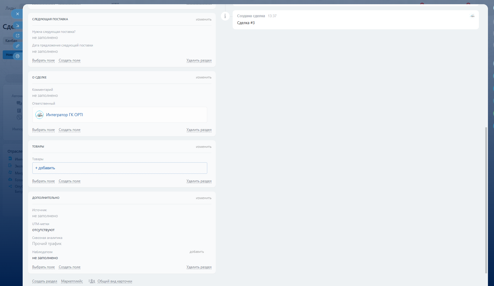 Для каждого направления сделок настроены свои разделы, поля и обязательность заполнения полей в зависимости от стадии сделки.
