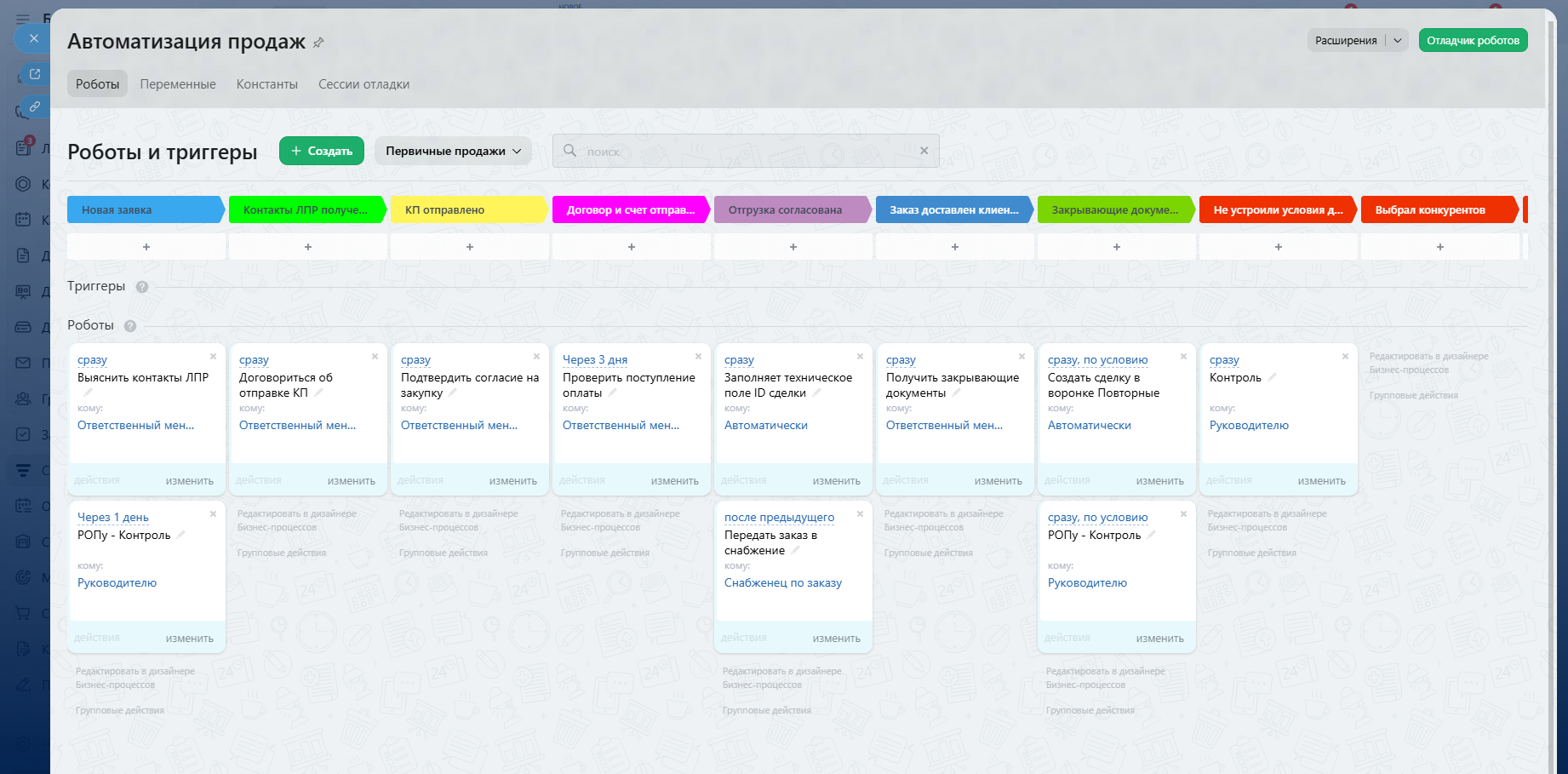 В сделке автоматически ставится дело «Выяснить контакты ЛПР», как только в воронке продаж на стадии «Новый заказ» появляется новая сделка. Если сделка остается на этапе «Новый заказ» дольше 1 дня, то руководитель отдела продаж получает автоматическое уведомление.