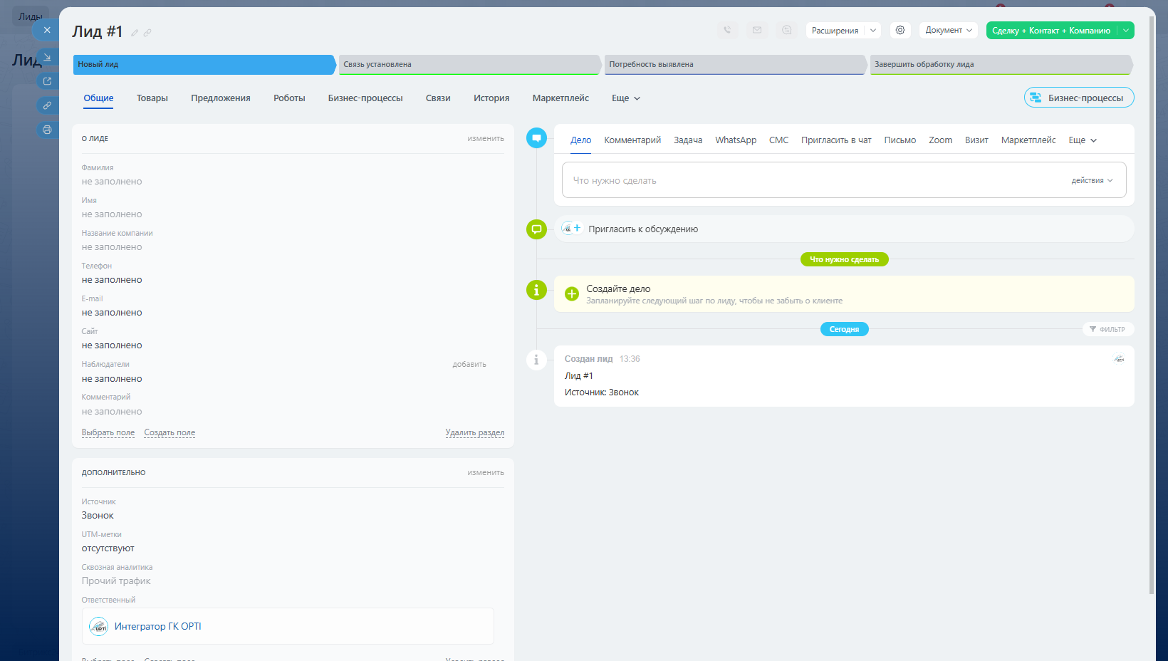 Добавьте все каналы трафика и источники связи в ваш контакт-центр, а роботы в воронке ЛИДов напомнят о необходимых действиях, чтобы сконвертировать ЛИДа в клиента.