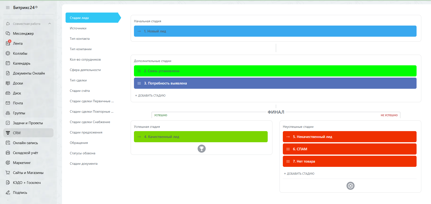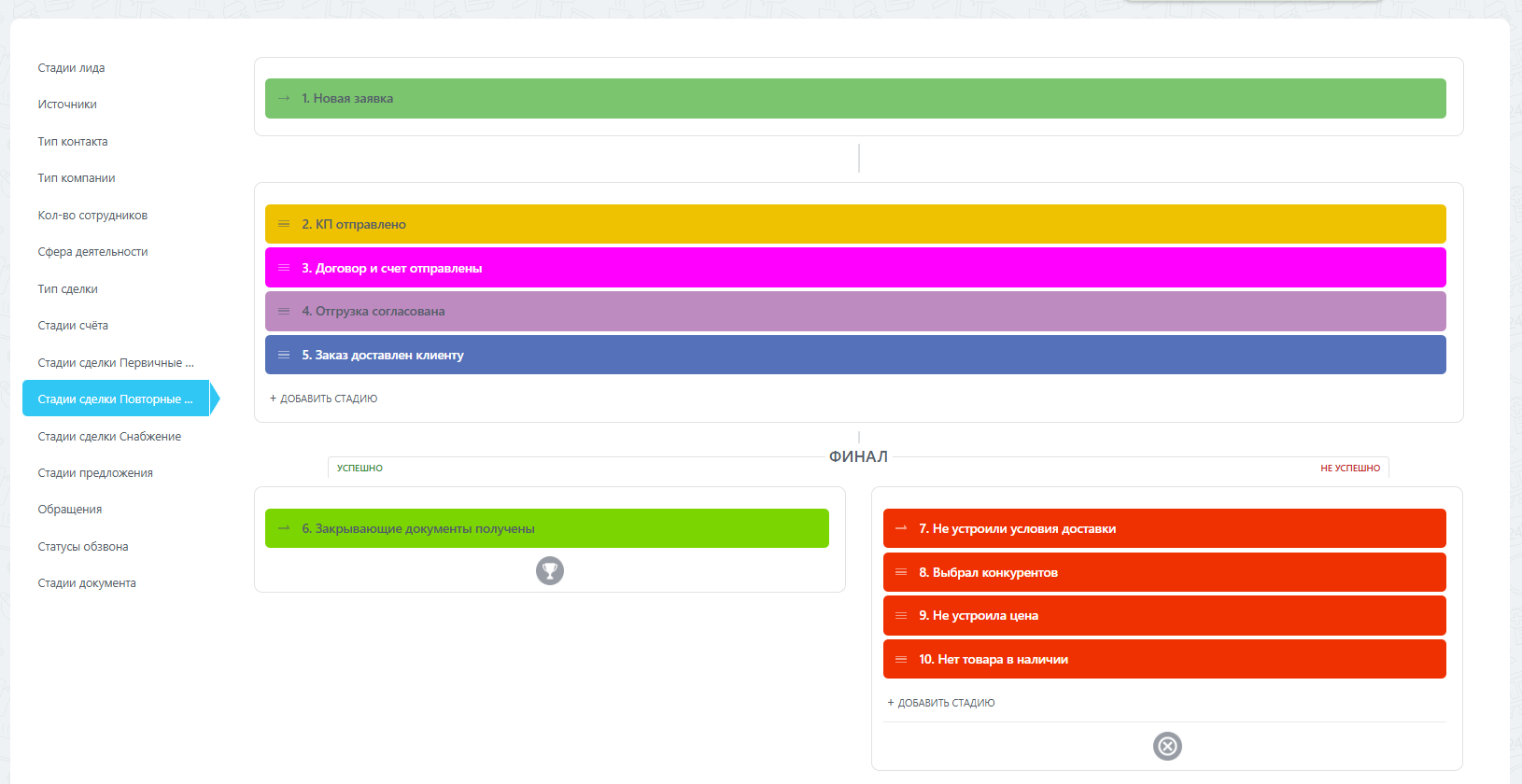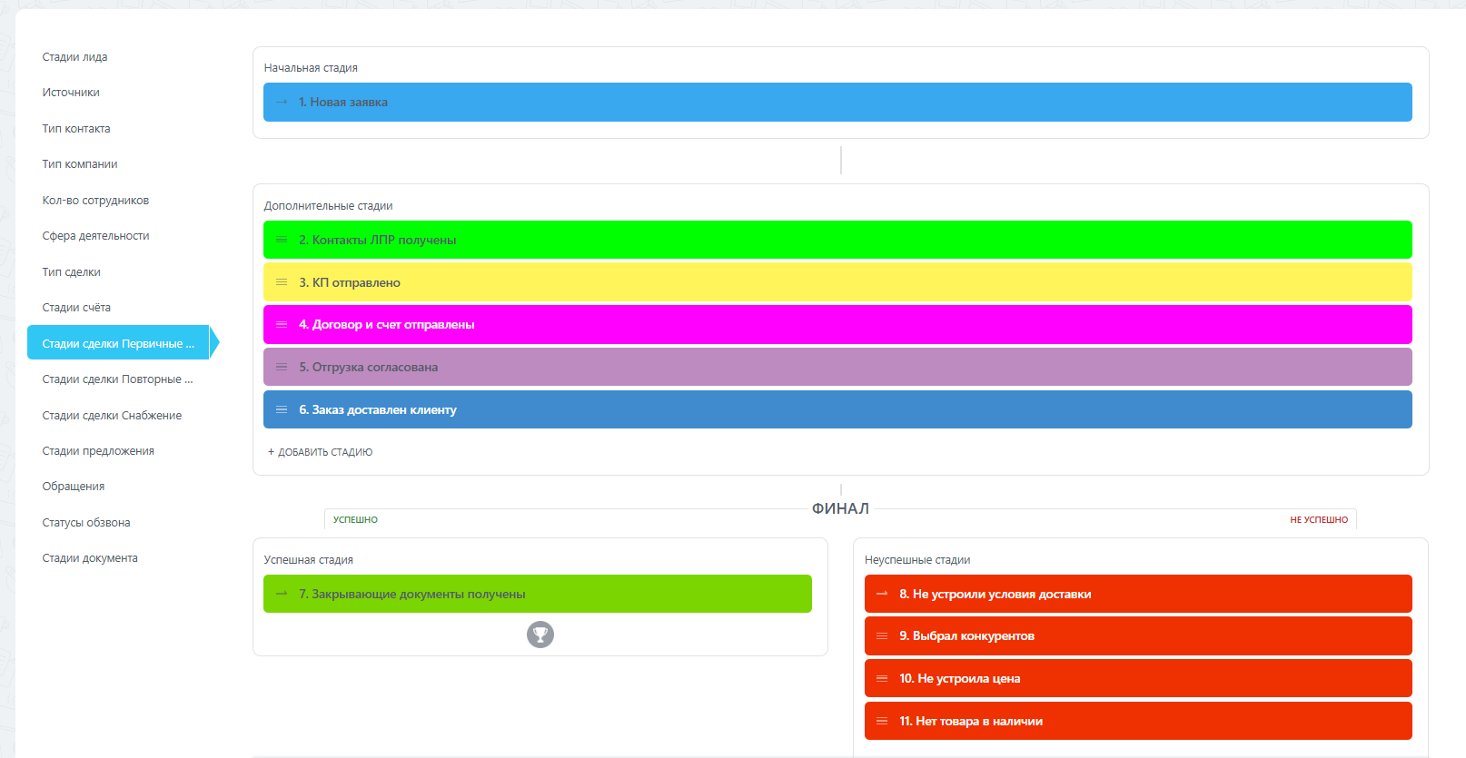 CRM для вашего бизнеса полностью настроена. При настройках учли все этапы Сделки.