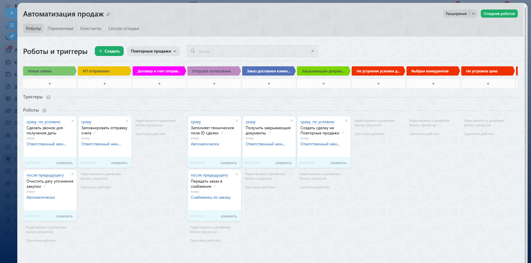 В воронке Повторные продажи также настроена автоматическая постановка дел в зависимости от стадии, на которой находится сделка. Дела аналогичны делам в воронке Первичные продажи.