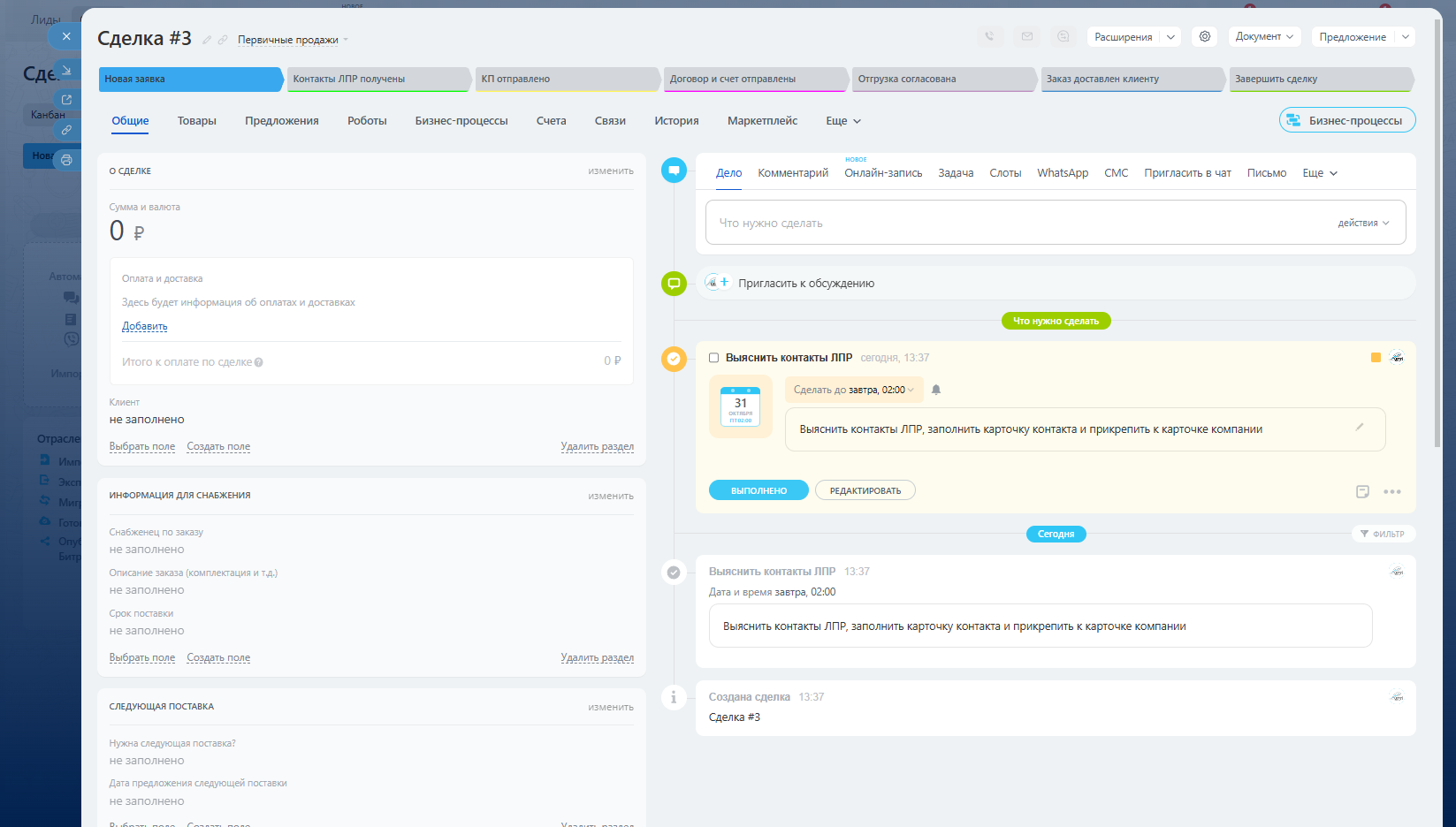 На стадии «Контакты ЛПР получены» в сделку добавляется дело «Договориться об отправке КП». На стадии «КП отправлено» ставится дело «Подтвердить согласие на закупку».