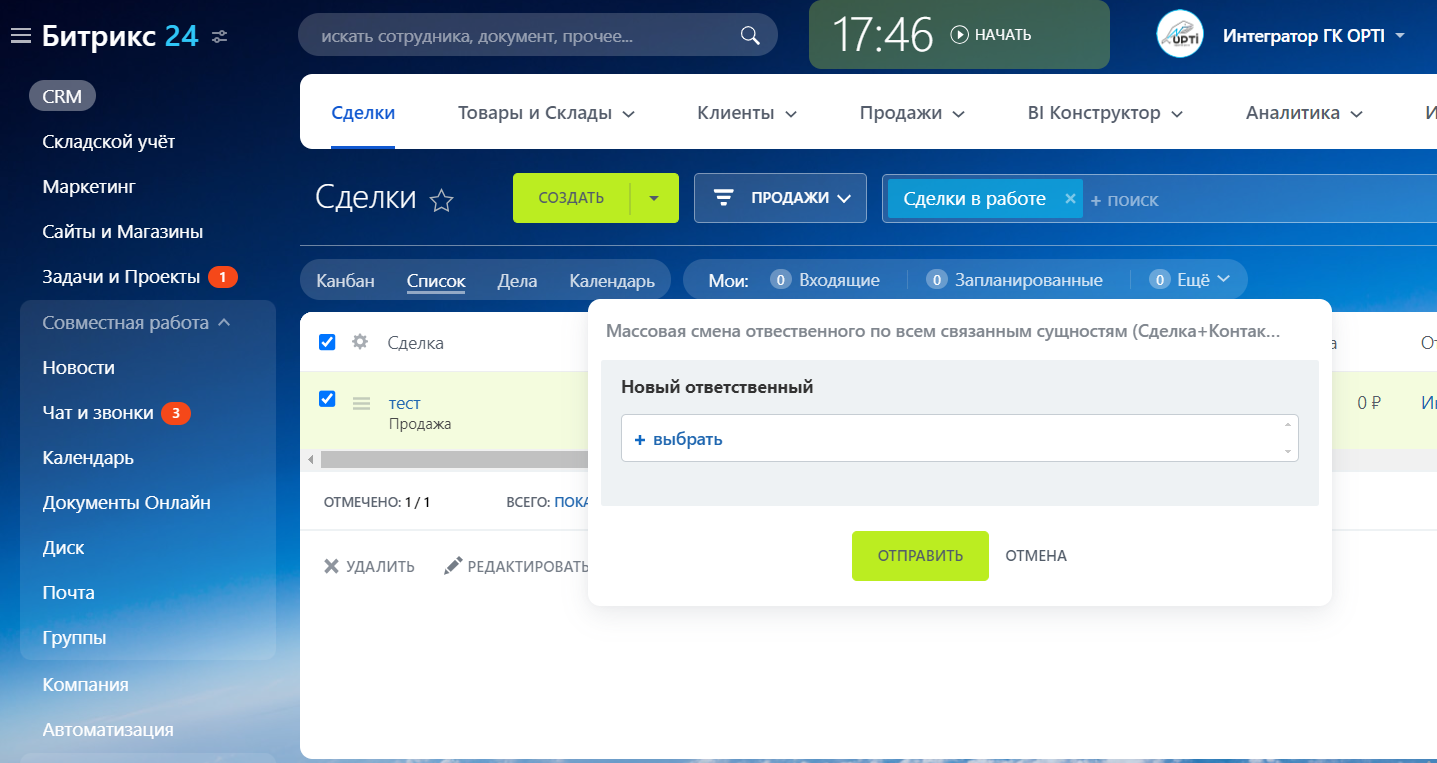 - В Сделках будет изменён ответственный. В карточке Контакта и Компании ответственный заменится тоже (и будет совпадать с ответственным у сделки)