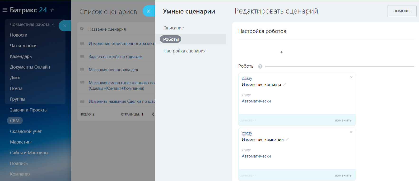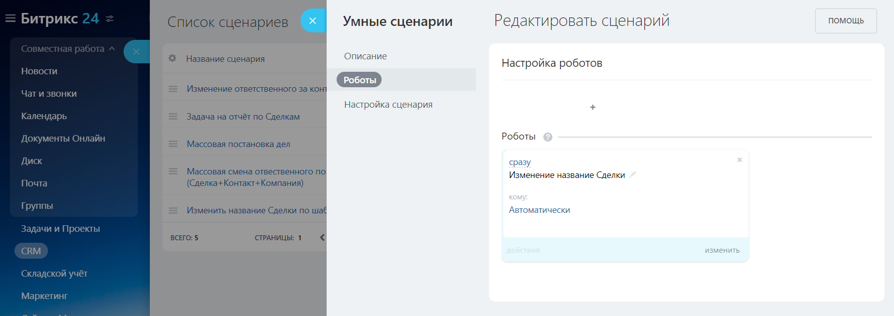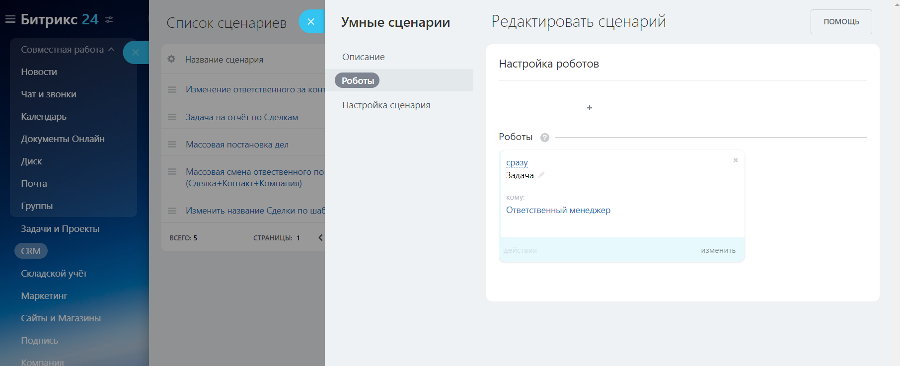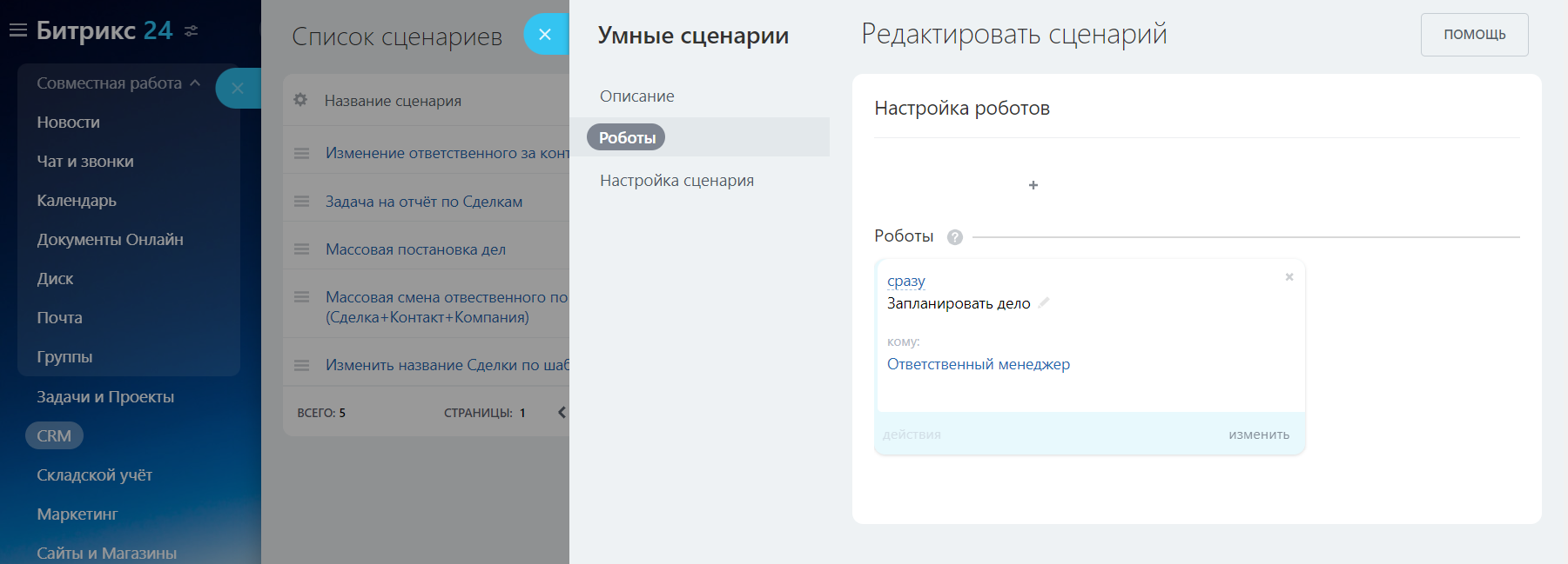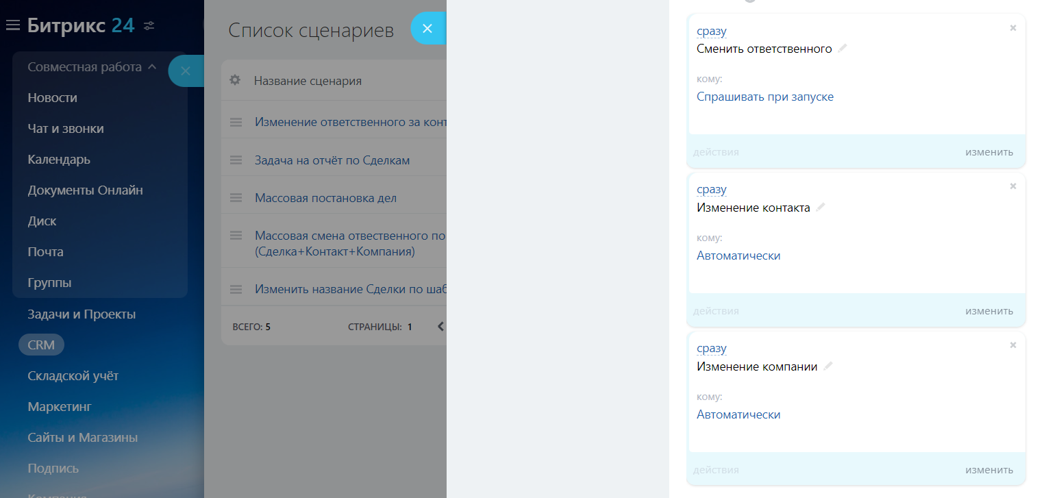 Самый популярный сценарий - это смена ответсвенного по Сделке. Позволяет экономить время на смене ответственных в клиентской базе!