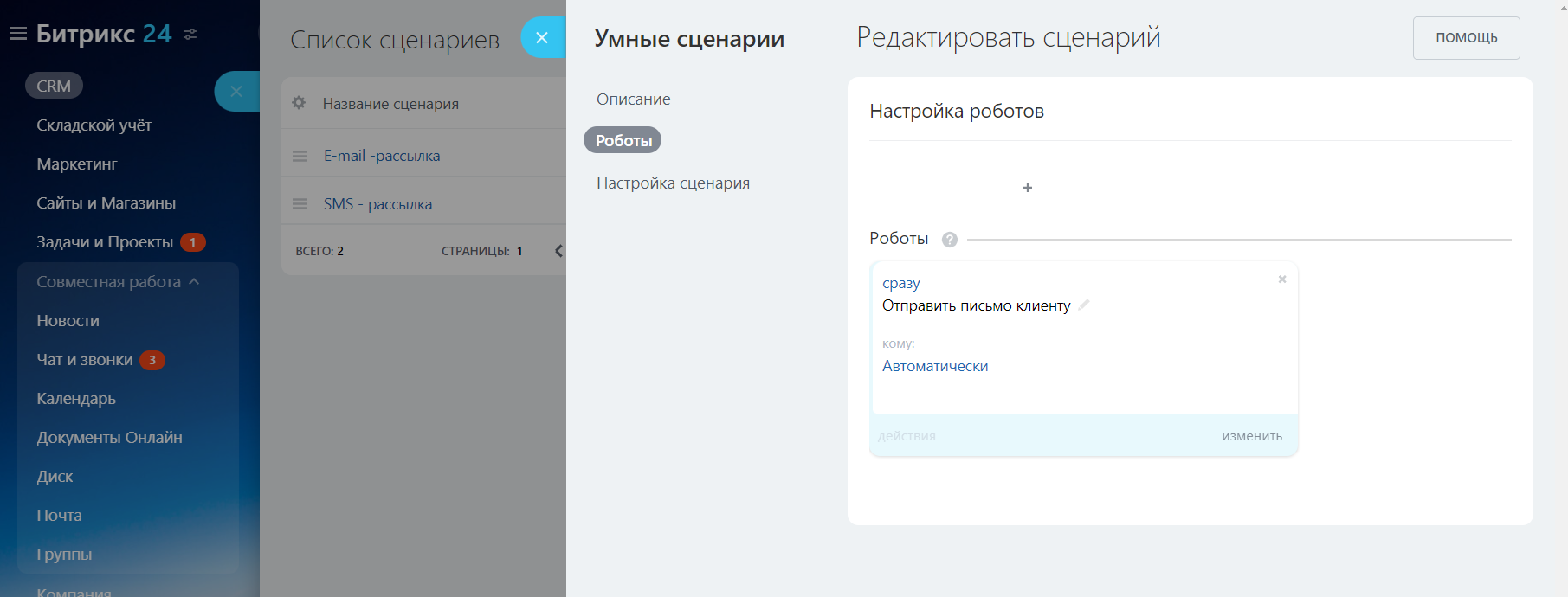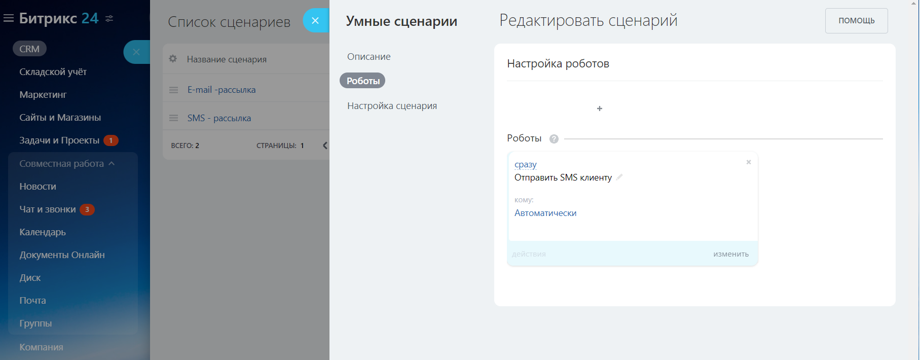 Мы создали 2 умных сценария, с помощью которых можно запустить рассылку по выбранным Сделкам. !Для отправки SMS требуется дополнительно подключить SMS-провайдера!