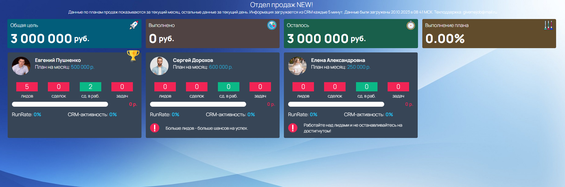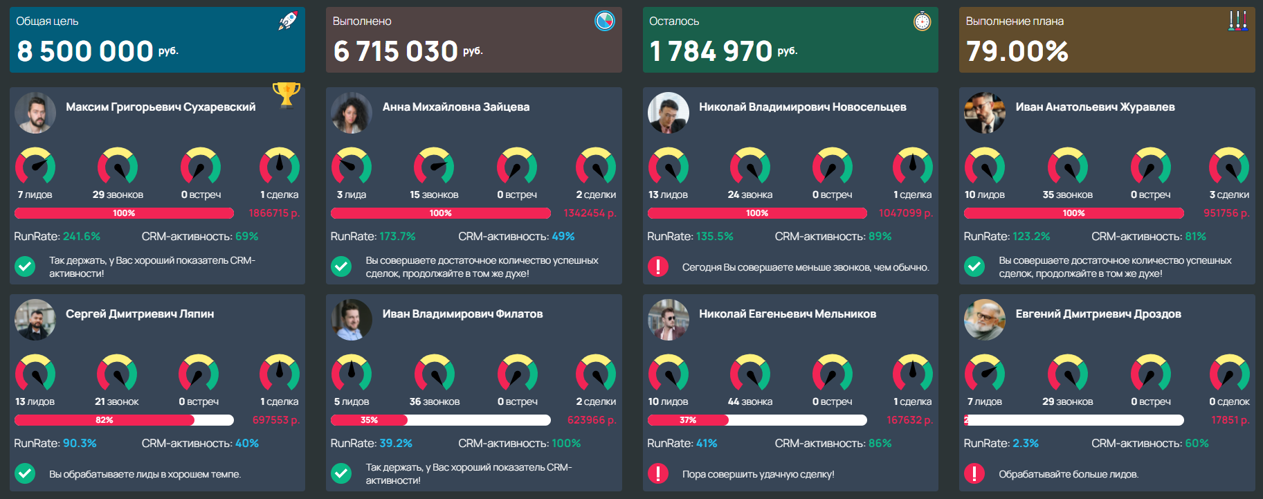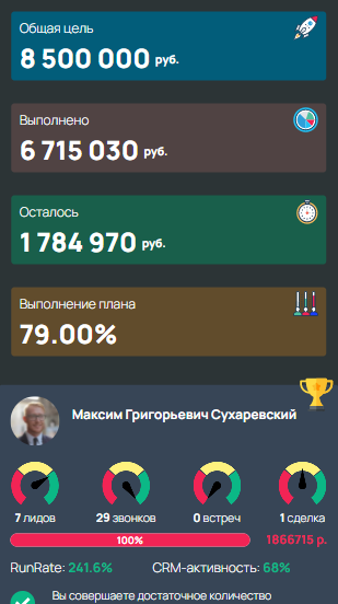 Выводит в наглядном виде данные об активности сотрудников и мотивирует их на выполнение плана продаж.
