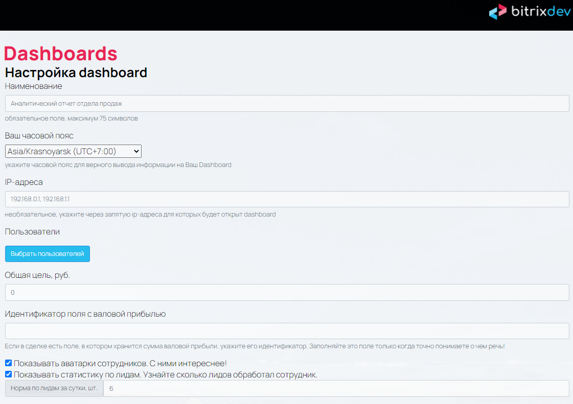 4. Заполните поля формы настройки дашборда, все они имеют описание, это не займет много времени. Нажмите кнопку "сохранить";