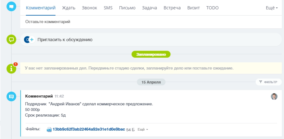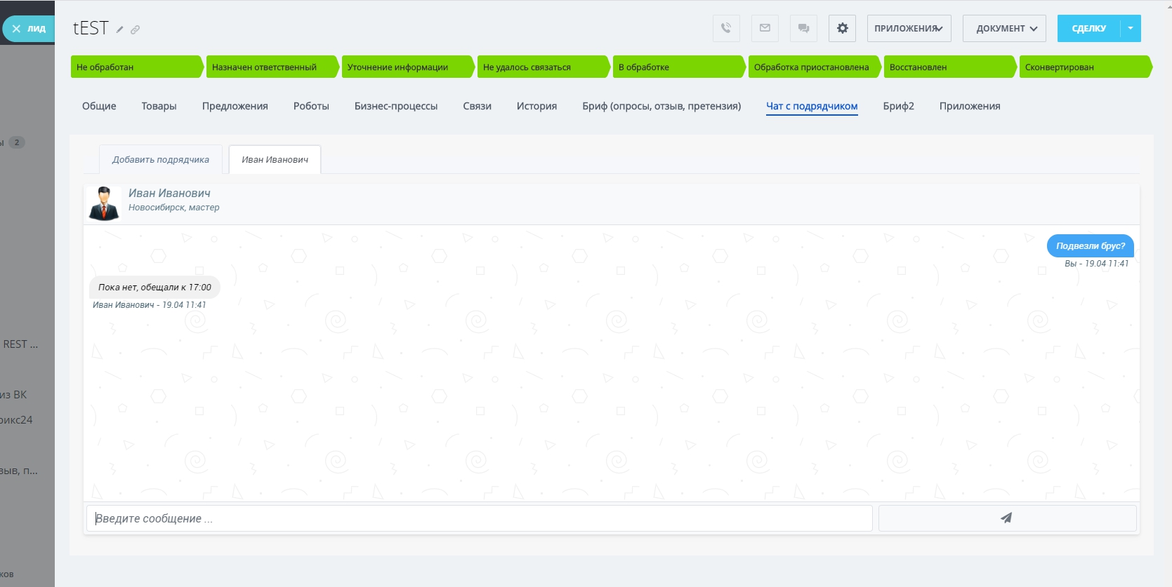 Чат с подрядчиком - это быстрая коммуникация с подрядчиком по сделке или лиду.