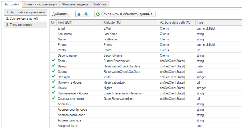 Перед началом выгрузки нНа стороне 1С-Отель настраивается соответствие полей.