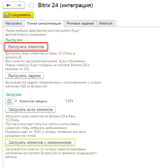 Приложение позволяет подключить вашу базу 1С-Отель к порталу Битрикс24.