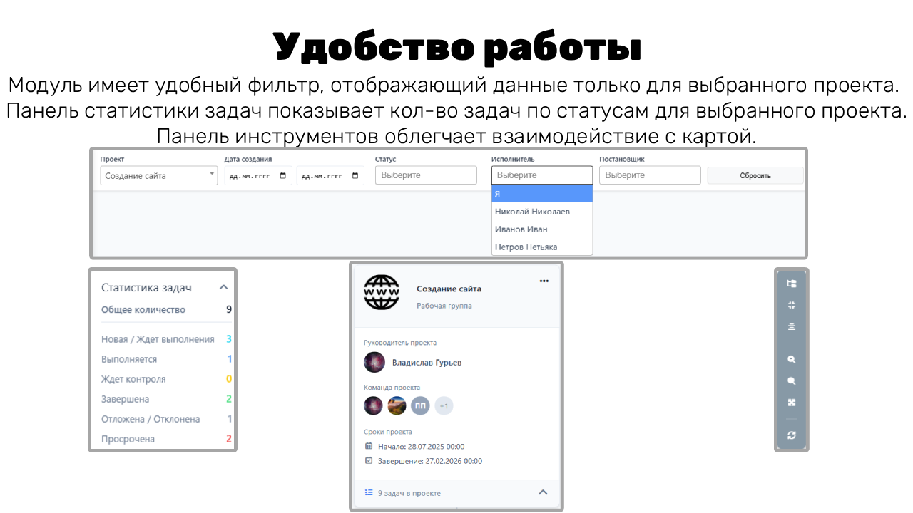 ✅ Каждая точка на карте — живая задача: Кликайте на любой элемент, чтобы открыть и редактировать всю информацию: историю, исполнителей, комментарии, файлы — всё, как в привычной карточке задачи.