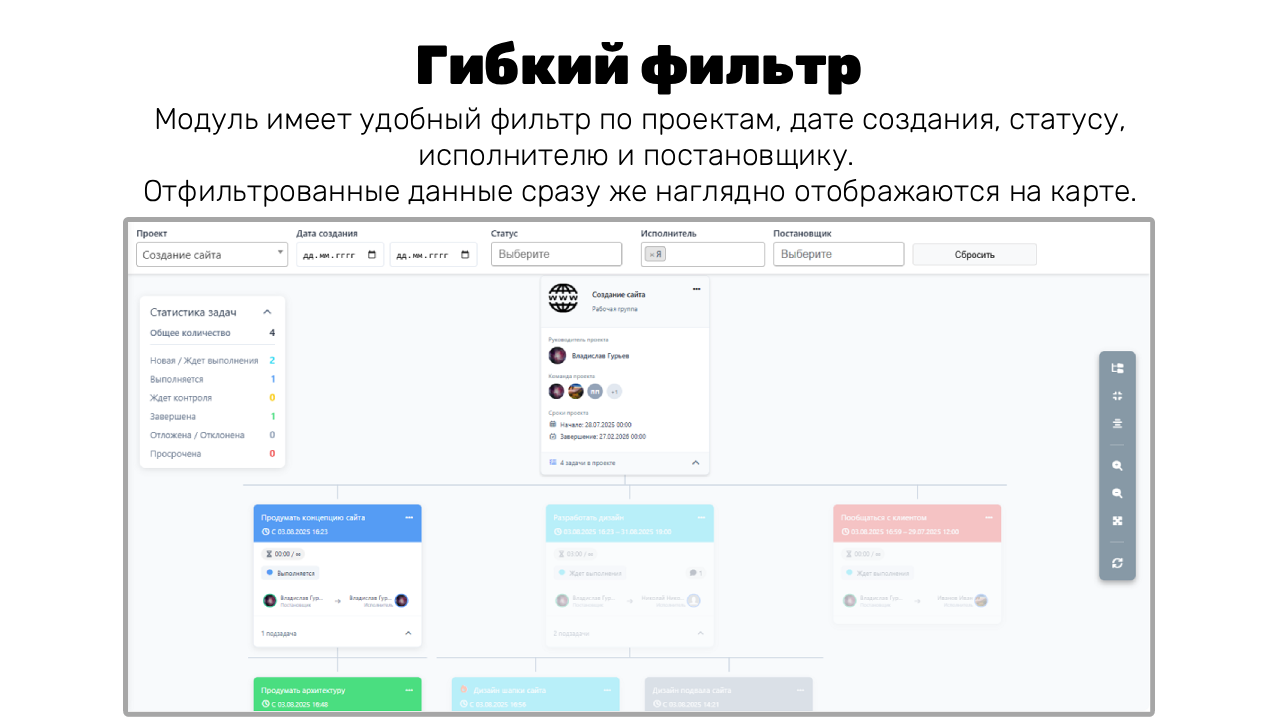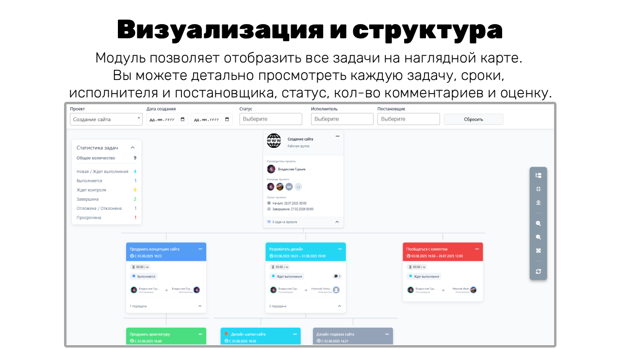 ✅ Мощная система фильтрации: Создавайте нужные вам представления, фильтруя карту по проекту, исполнителю, статусу, сроку или постановщику. Скрывайте лишнее, чтобы сконцентрироваться на главном.