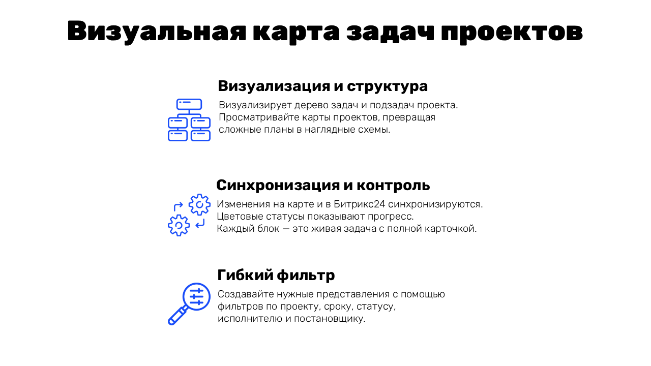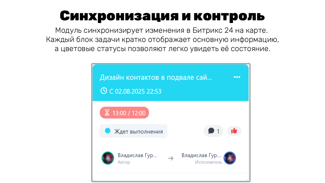 ✅ Двусторонняя синхронизация в реальном времени: Любые изменения статуса, сроков или названия задачи на карте отражаются в Битрикс24, и наоборот.